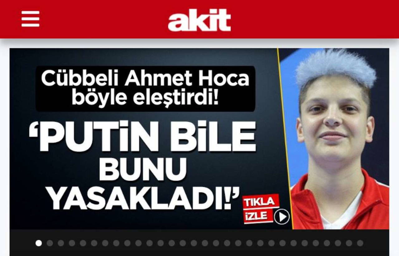 Burada Ebrar Karakurt'u hedef alarak "milli formayı giymesin" diyenlere destek veren Akit, haberinde, "Rusya Devlet Başkanı Putin'in bile eşcinselliği yasakladığını hatırlatan Cübbeli Ahmet Hoca, sapkınlığın üzerimize lanet yağmasına sebep olduğunu anlattı" ifadelerine yer verdi.