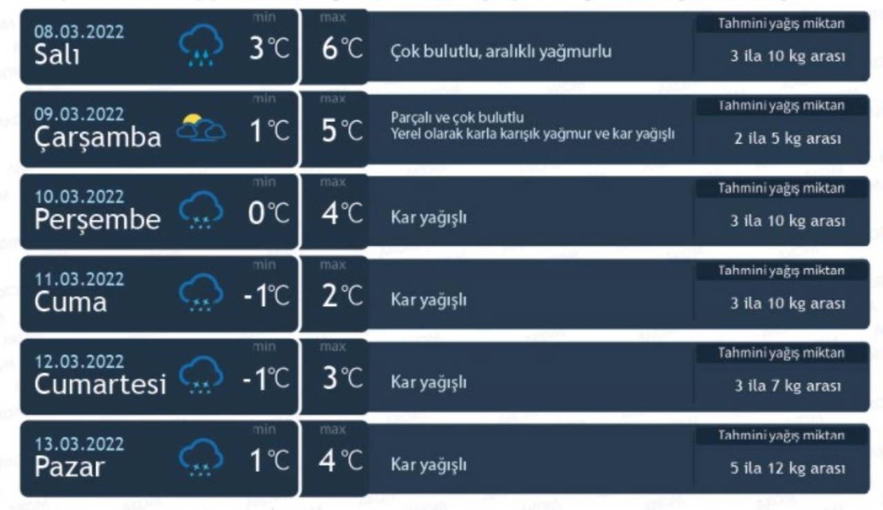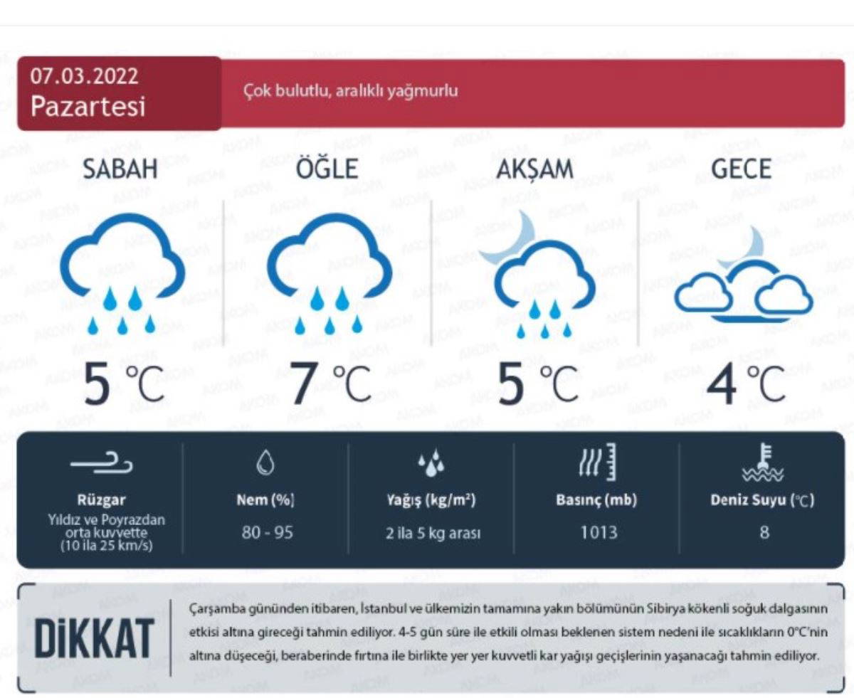 AKOM tarafından yayımlanan uyarıya göre İstanbul’da perşembe günü metrekareye 3 ila 10 kilogram kar yağışı beklenirken pazar gününe kadar yağış kuvvetini artırarak devam edecek. Pazar günü metrekareye 5 ila 12 kilogram kar bekleniyor.