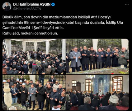 "Büyük âlim, son devrin din mazlumlarından İskilipli Atıf Hoca'yı şehadetinin 99. sene-i devriyesinde kabri başında dualarla, İskilip Ulu Camii’de Mevlîd-i Şerîf ile yâd ettik. Ruhu şâd, mekanı cennet olsun." ifadelerini kullanmıştı.