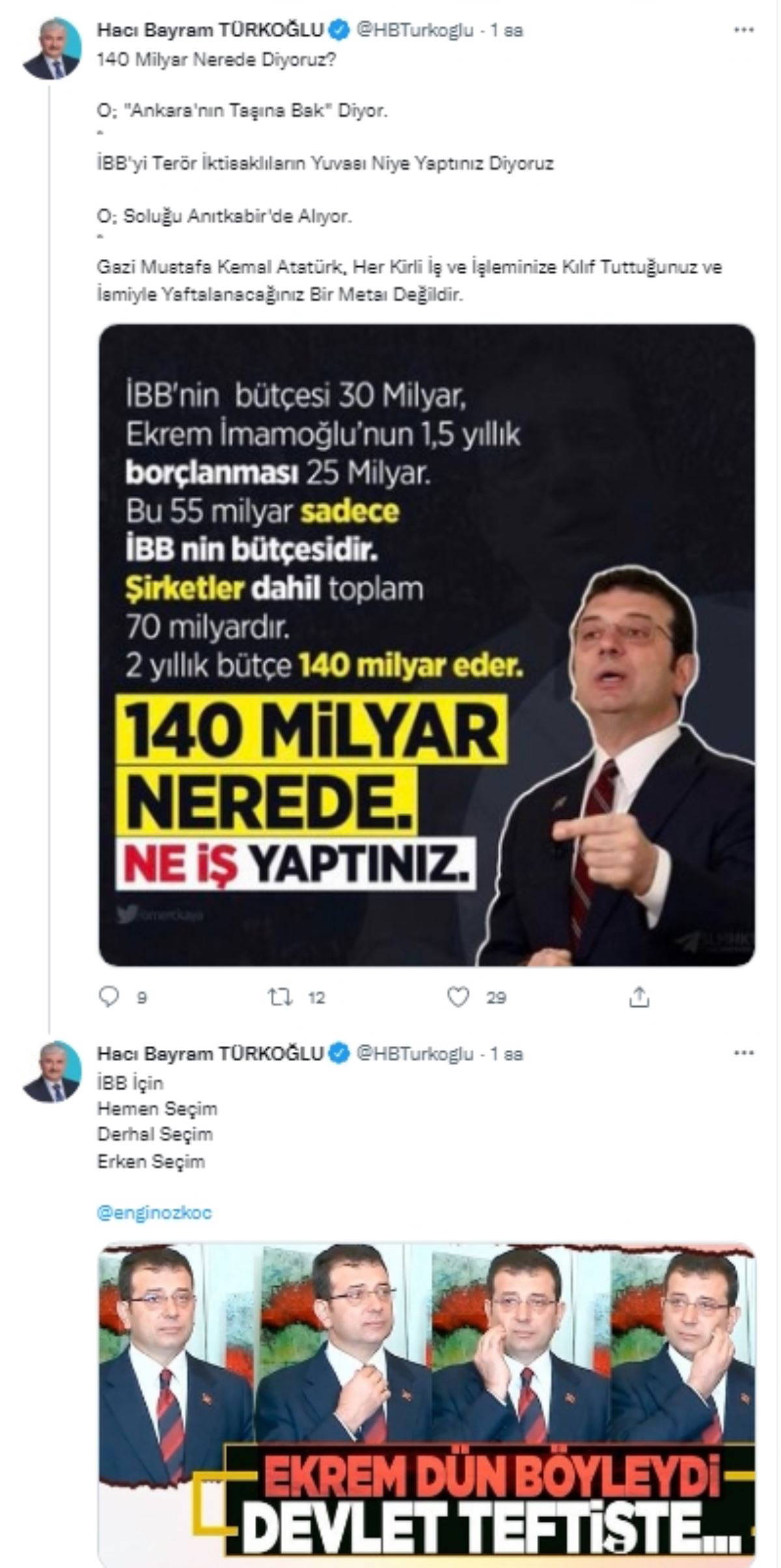 Paylaşımında “140 milyar nerede diyoruz? O; "Ankara'nın Taşına Bak" diyor. İBB'yi terör iltisaklıların yuvası niye yaptınız?' diyoruz. O, soluğu Anıtkabir'de alıyor. Gazi Mustafa Kemal Atatürk, her kirli iş ve işleminize kılıf tuttuğunuz ve ismiyle yaftalanacağınız bir metaı değildir" diyen Türkoğlu, "İBB için hemen seçim derhal seçim erken seçim” çağrısı yaptı.