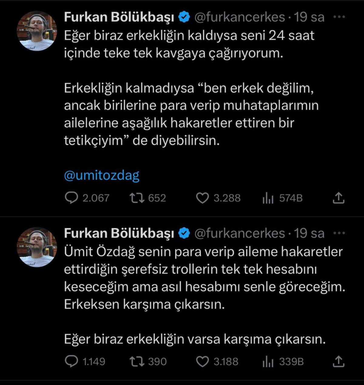 AKP'nin trollerinden biri olarak tanınan Furkan Bölükbaşı, sosyal medya hesabı üzerinden Zafer Partisi Genel Başkanı Ümit Özdağ’ı kavgaya çağırdı.