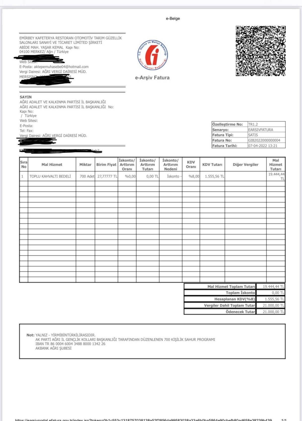Ağrı Belediye Başkanı Savcı Sayan, Twitter hesabından bir video ve akabinde sahur etkinliğinin faturasını paylaştı.