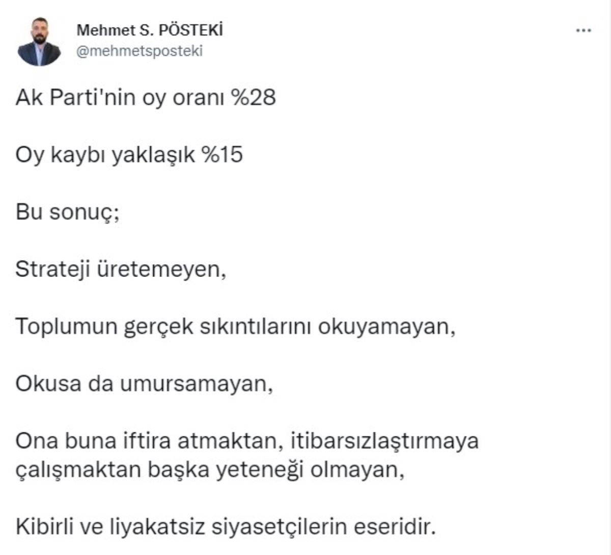 "Ak Parti'nin oy oranı yüzde 28. Oy kaybı yaklaşık yüzde 15. Bu sonuç; strateji üretemeyen, toplumun gerçek sıkıntılarını okuyamayan, okusa da umursamayan, ona buna iftira atmaktan, itibarsızlaştırmaya çalışmaktan başka yeteneği olmayan, kibirli ve liyakatsiz siyasetçilerin eseridir."