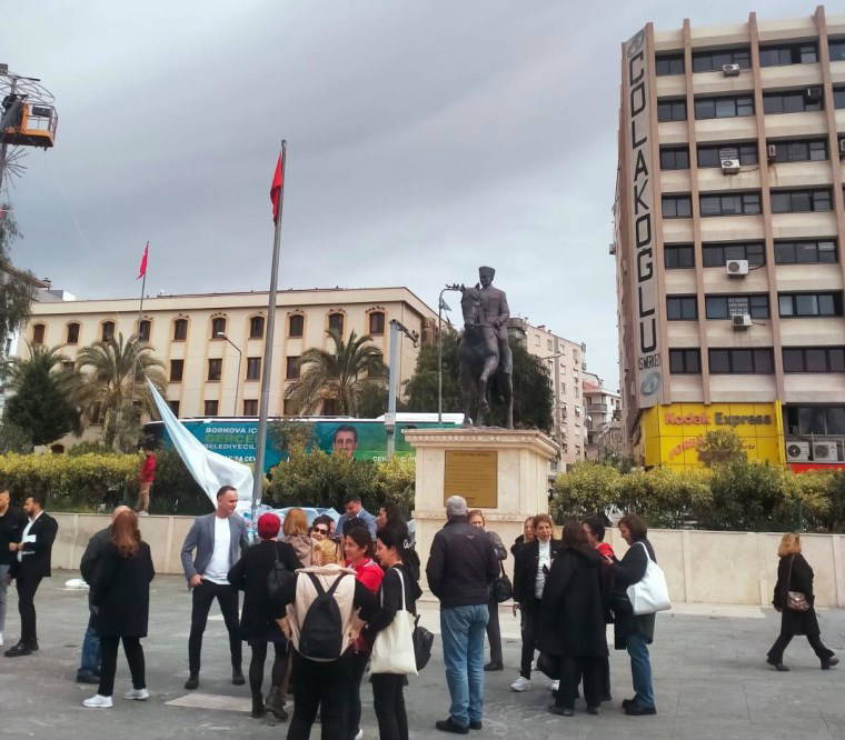 Yurttaşlar, Dağ ve AKP Bornova Belediye Başkanı Cevdet Çayır’ın fotoğraflarının olduğu afişin hem Atatürk heykelini hem de Türk Bayrağı’nı kapatacak şekilde asılmasına tepki gösterdi.