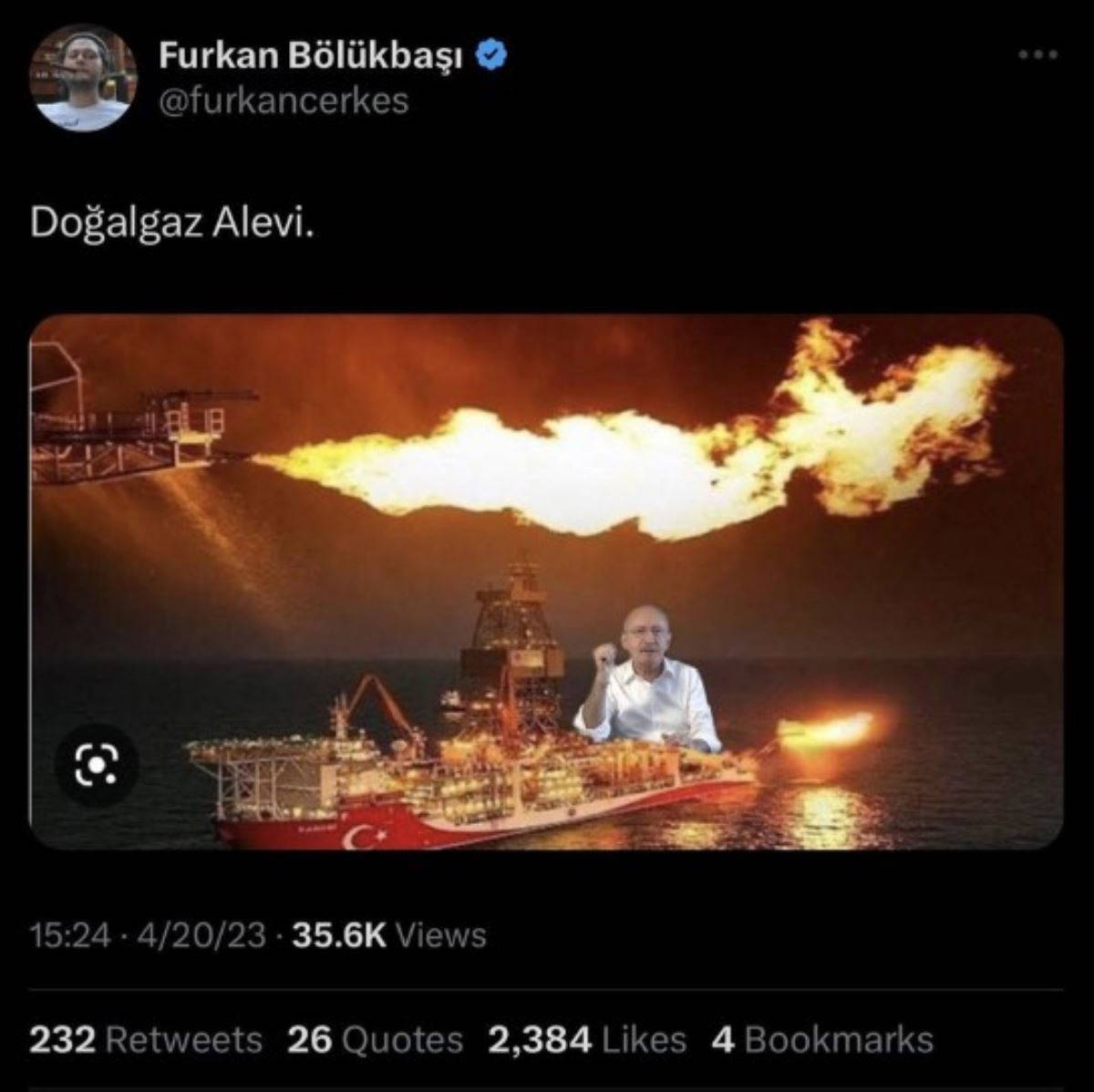 Millet İttifakı'nın Cumhurbaşkanı adayı Kemal Kılıçdaroğlu'nun 'Alevi' başlıklı videosu üzerinden paylaşımlar yapan Bölükbaşı, AKP'li Cumhurbaşkanı Erdoğan'ın doğalgaz açıklaması üzerine Kılıçdaroğlu'nun fotoğrafını montajlayarak "Doğalgaz alevi" dedi.