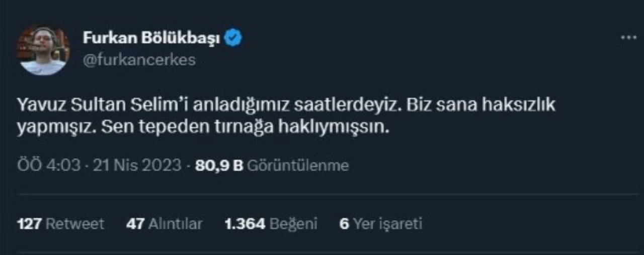 Bölükbaşı, "Yavuz Sultan Selim'i anladığımız saatlerdeyiz. Biz sana haksızlık yapmışız. Sen tepeden tırnağa haklıymışsın" ifadelerini kullandı.