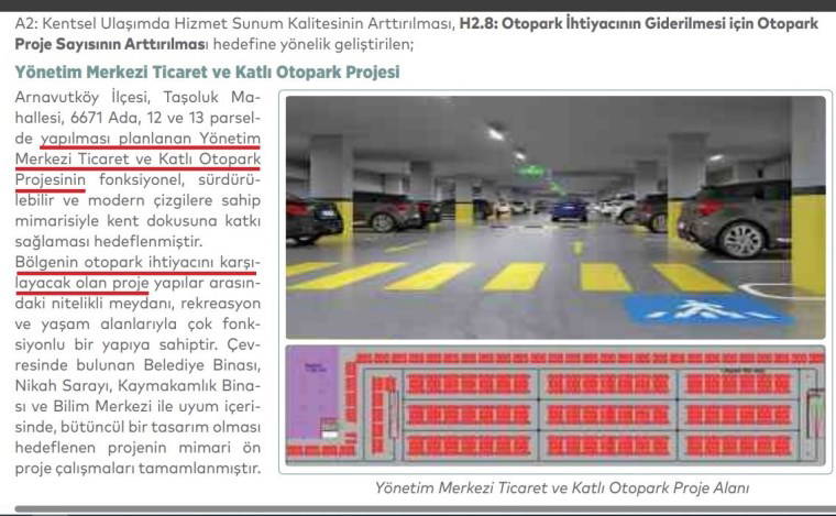 Söz konusu alan, Arnavutköy Belediyesi’nin 2022 Faaliyet Raporunda, “Yönetim Merkezi Ticaret ve Katlı Otopark Projesi”nin uygulanacağı alan olarak tanımlanmıştı. Raporda şu ifadelere yer verilmişti: