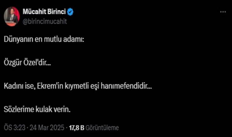 Sosyal medya hesabından bir paylaşım yapan Birinci, "Dünyanın en mutlu adamı: Özgür Özel'dir... Kadını ise, Ekrem'in kıymetli eşi hanımefendidir... Sözlerime kulak verin" ifadelerini kullandı.