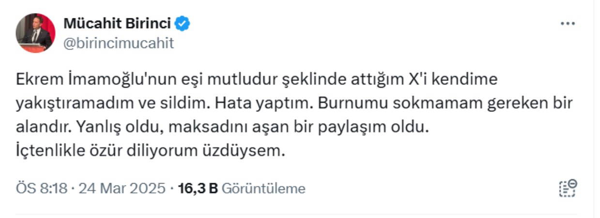 Birinci, söz konusu tepkilerin ardından paylaşımını silip açıklama yaptı.