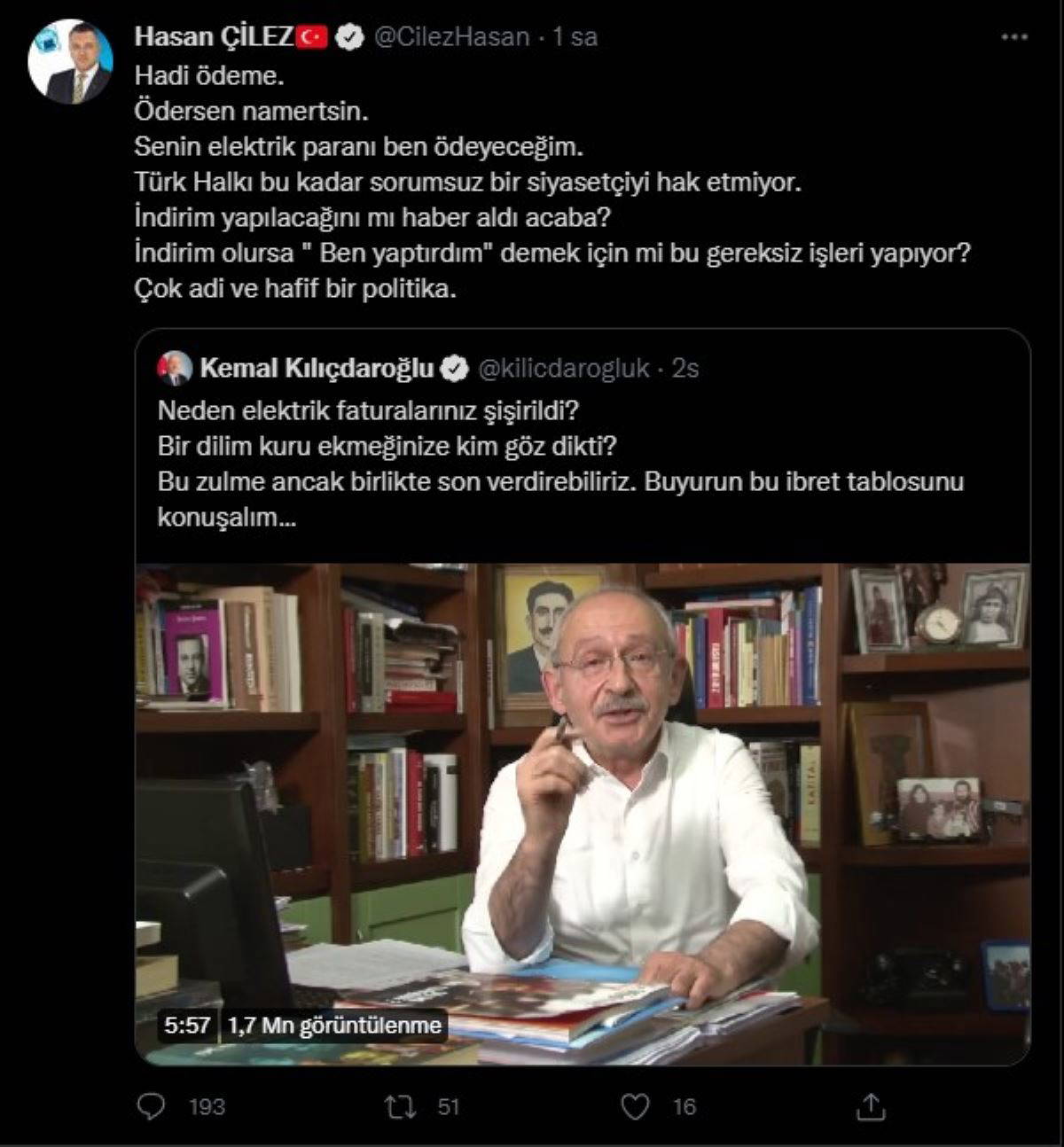 Kılıçdaroğlu'nu hedef alan Çilez, "Hadi ödeme. Ödersen namertsin. Senin elektrik paranı ben ödeyeceğim. Türk Halkı bu kadar sorumsuz bir siyasetçiyi hak etmiyor. İndirim yapılacağını mı haber aldı acaba? İndirim olursa " Ben yaptırdım" demek için mi bu gereksiz işleri yapıyor? Çok adi ve hafif bir politika" ifadelerine yer verdi.