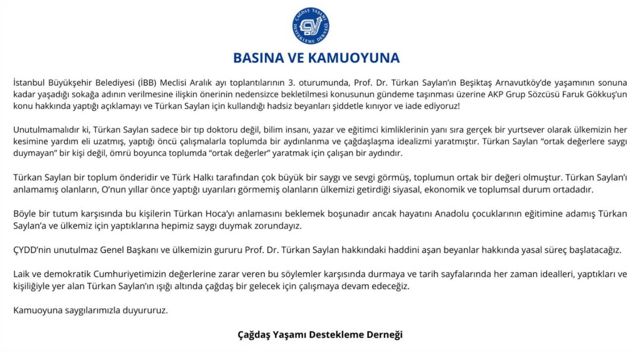 İstanbul Büyükşehir Belediye (İBB) Meclisi toplantısında AKP Grup Sözcüsü Faruk Akkuş'un Türkan Saylan'la ilgili sözlerininin ardından Çağdaş Yaşamı Destekleme Derneği'nden hamle geldi.