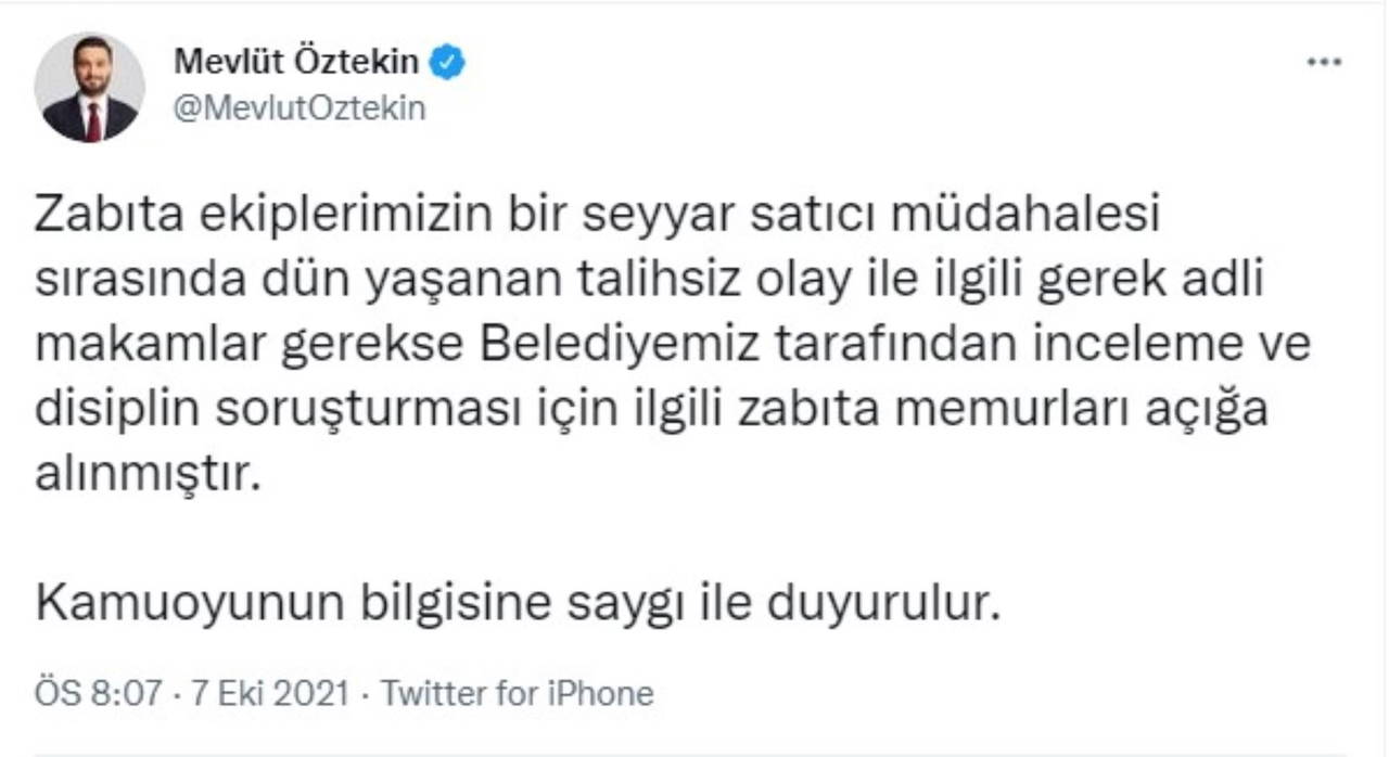 Kağıthane Belediye Başkanı Mevlüt Öztekin konuyla ilgili sosyal medya hesabından açıklama yaptı. Görüntülerdeki zabıta şiddetini kabul eden Öztekin, "Zabıta ekiplerimizin bir seyyar satıcı müdahalesi sırasında dün yaşanan talihsiz olay ile ilgili gerek adli makamlar gerekse Belediyemiz tarafından inceleme ve disiplin soruşturması için ilgili zabıta memurları açığa alınmıştır" ifadelerine yer verdi.