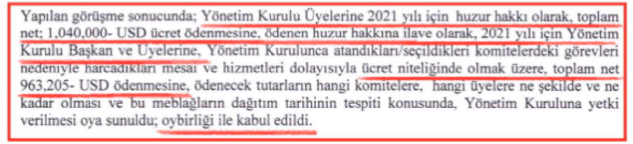 Tutanakta, "Yapılan görüşme sonucunda; Yönetim Kurulu Üyelerine 2021 yılı için huzur hakkı olarak, toplam net; 1,040,000- USD ücret ödenmesine, ödenen huzur hakkına ilave olarak 2021 yılı için Yönetim Kurulu Başkan ve Üyelerine, Yönetim Kurulunca atandıkları/seçildikleri komitelerdeki görevleri nedeniyle harcadıkları mesai ve hizmetleri dolayısıyla ücret niteliğinde olmak üzere, toplam net 963.205- USD ödenmesine, ödenecek tutarların hangi komitelere, hangi üyelere ne şekilde ve ne kadar olması ve bu meblağların dağıtım tarihinin tespiti konusunda, Yönetim Kuruluna yetki verilmesi oya sunuldu; oybirliği ile kabul edildi" ifadelerine yer verildi.