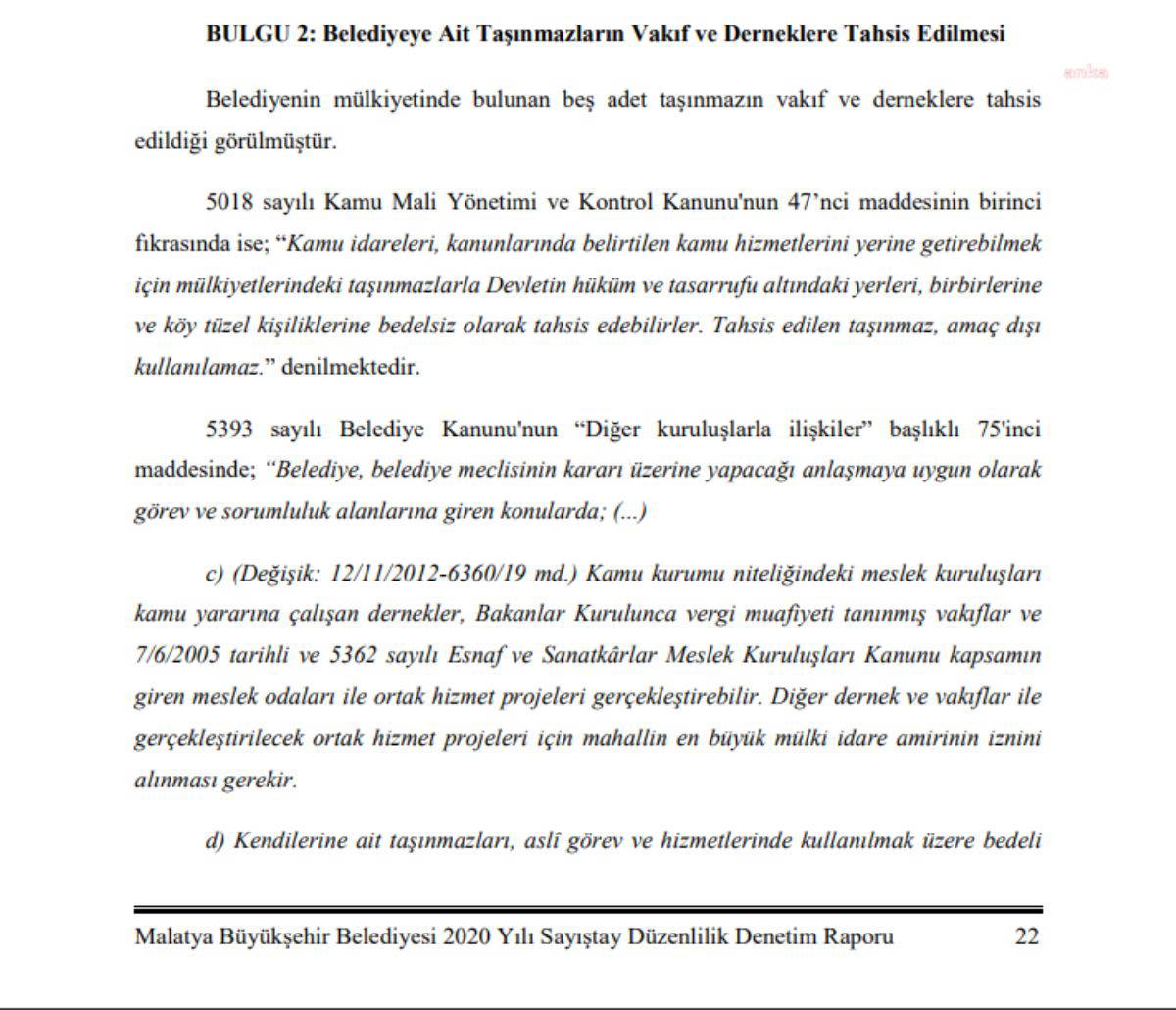 Sayıştay, Malatya Büyükşehir Belediyesi’nin 2020 yılına ilişkin denetim raporunda; belediyeye ait bazı taşınmazların, vakıf ve derneklere tahsis ettiğini tespit etti. Sayıştay raporunda, "Belediyenin mülkiyetinde bulunan beş adet taşınmazın vakıf ve derneklere tahsis edildiği görülmüştür" denildi.