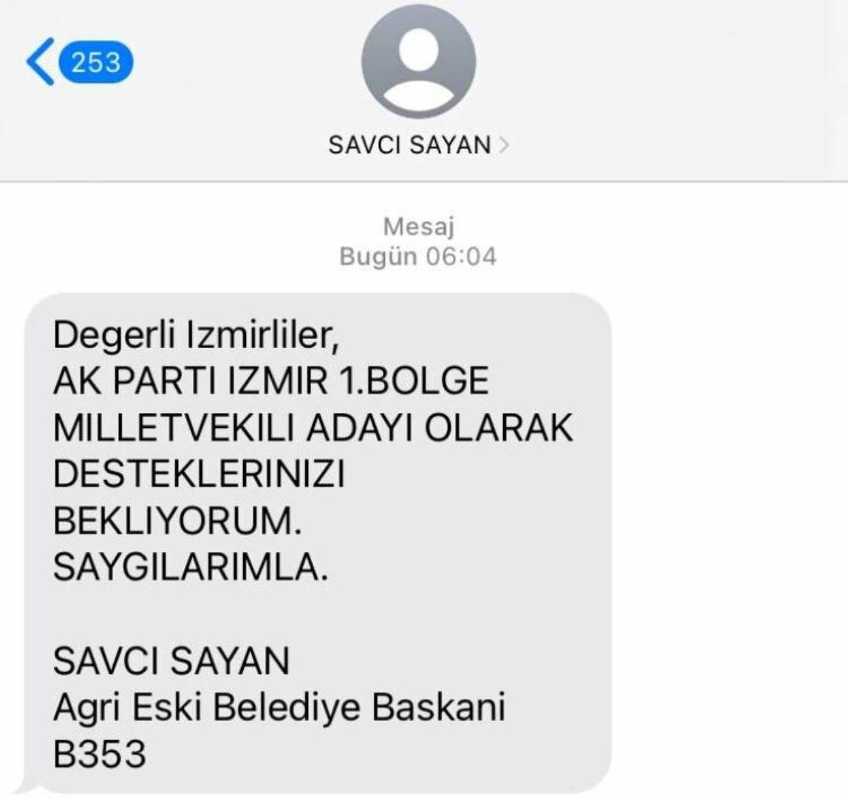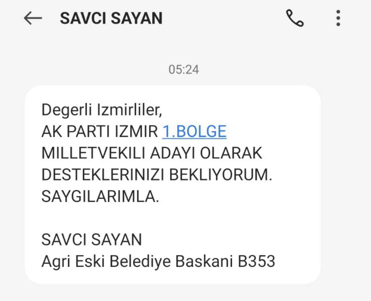 AKP İzmir 1. Bölge milletvekili adayı eski Ağrı Belediye Başkanı Savcı Sayan, mesajda “Değerli İzmirliler, AK Parti 1. Bölge Milletvekili adayı olarak desteklerinizi bekliyorum. Saygılarımla” ifadeleri kullandı.