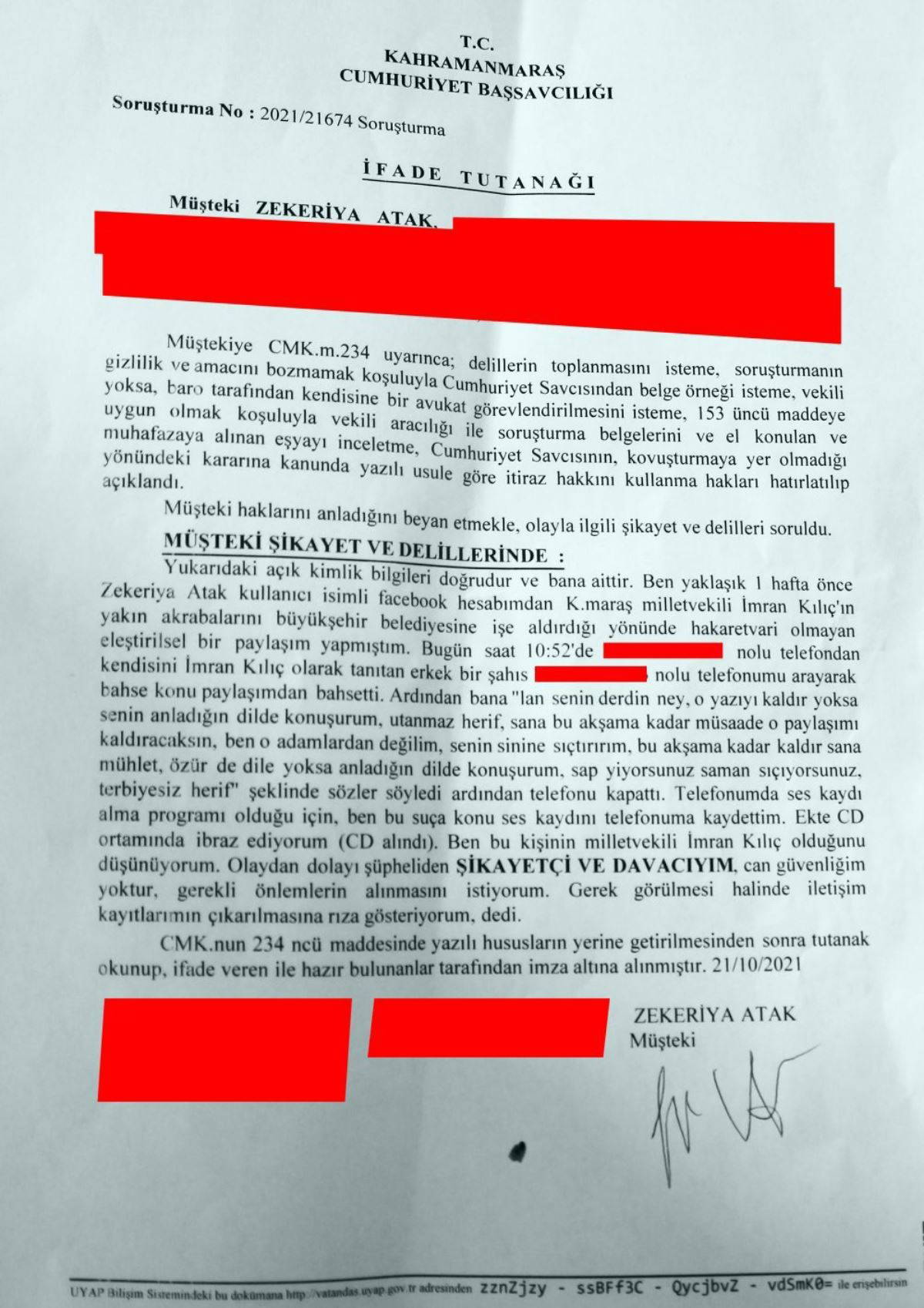 Sözcü'den ahmet Kaya'nın haberine göre, Zekeriya Atak ise, Milletvekili Kılıç'ın tehditlerini cep telefonuna kaydederek Kahramanmaraş Cumhuriyet Savcılığı'na suç duyurusunda bulundu.