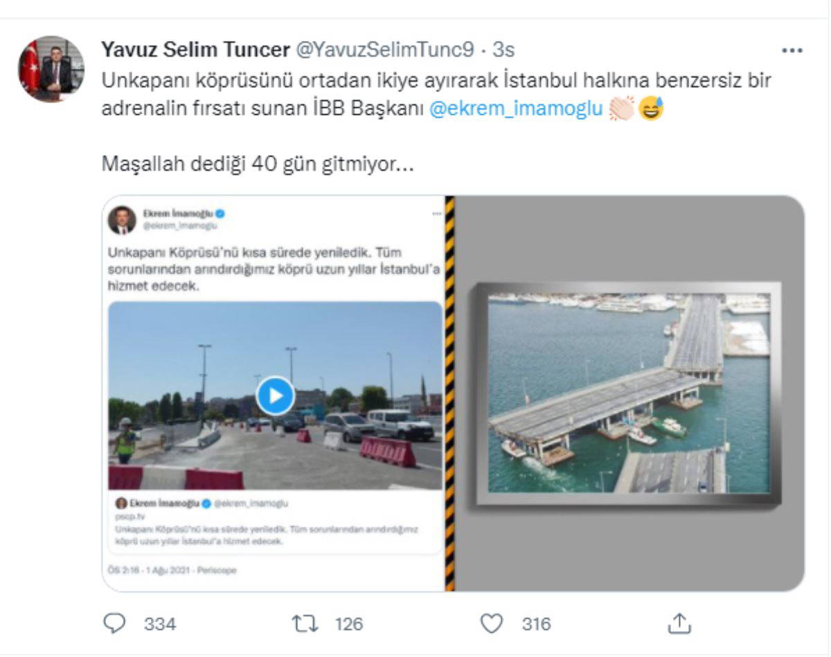 Sosyal medyadan paylaşım yapan Tuncer, “Unkapanı köprüsünü ortadan ikiye ayırarak İstanbul halkına benzersiz bir adrenalin fırsatı sunan İBB Başkanı Ekrem İmamoğlu. Maşallah dediği 40 gün gitmiyor…” ifadelerini kullandı.