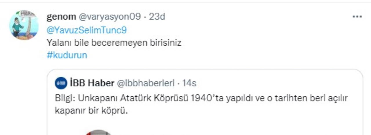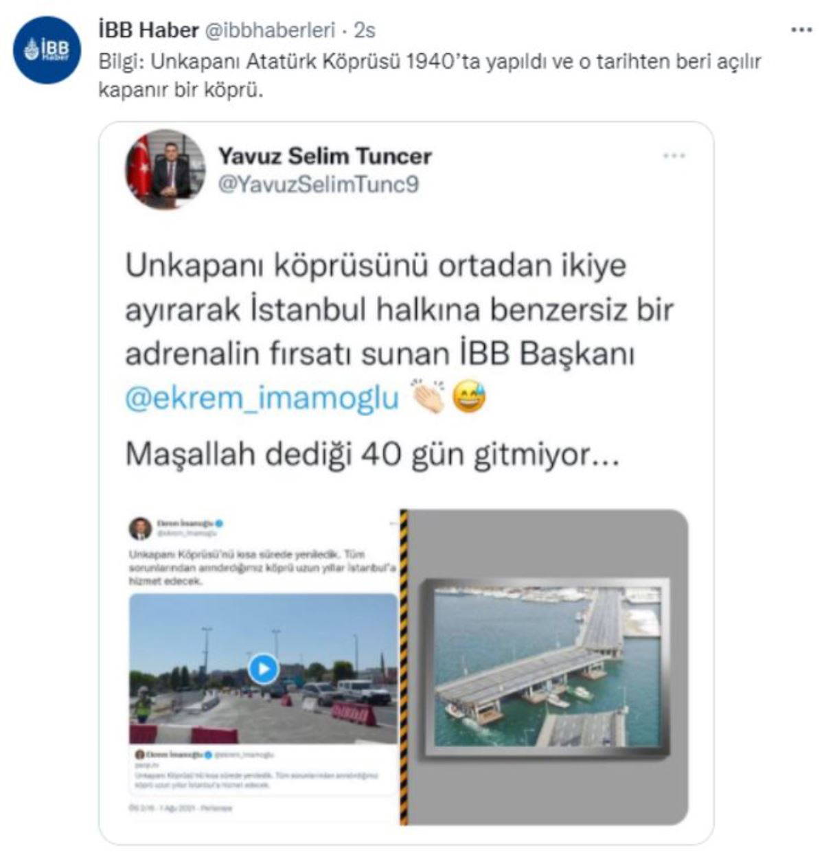 İBB Haber isimli sosyal medya hesabı ise Tuncer’in paylaşımını alıntılayarak cevap verdi. Hesaptan yapılan paylaşımda, “Bilgi: Unkapanı Atatürk Köprüsü 1940’ta yapıldı ve o tarihten beri açılır kapanır bir köprü” denildi.