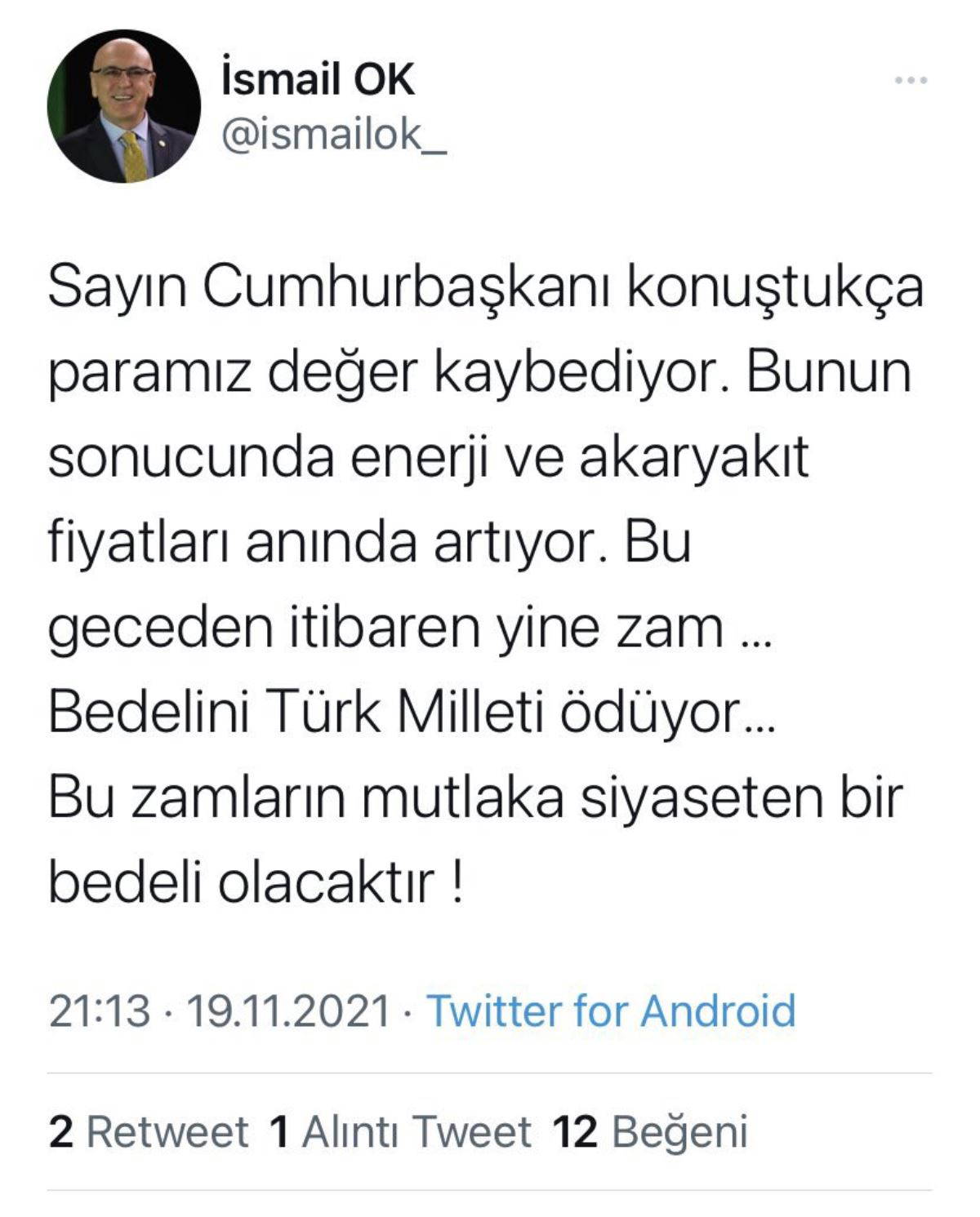 Ok, Kasım 2021'de yaptığı paylaşımında enerji fiyatlarının artmasına dikkat çekerek, "Sayın Cumhurbaşkanı konuştukça paramız değer kaybediyor. Bunun sonucunda enerji ve akaryakıt fiyatları anında artıyor. Bu geceden itibaren yine zam. Bedelini Türk milleti ödüyor. Bu zamların mutlaka siyaseten bir bedeli olacaktır" dediği görülüyor.