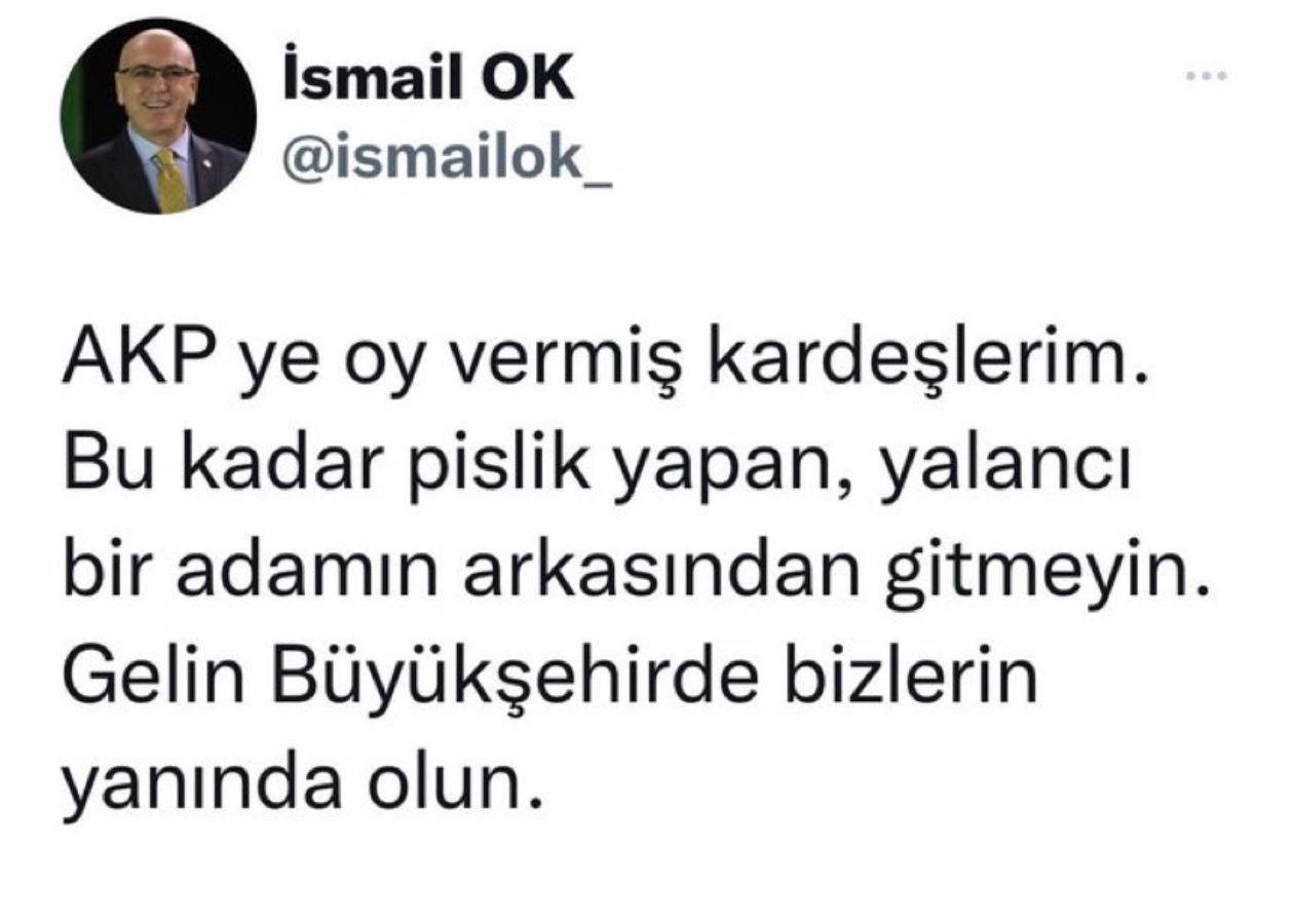 AKP'ye katılan Ok, başka bir paylaşımında da AKP'ye oy vermiş seçmenlere, "Kardeşlerim, bu kadar pislik yapan, yalancı bir adamın arkasından gitmeyin. Gelin büyükşehirde bizlerin yanında olun" diye sesleniyordu.