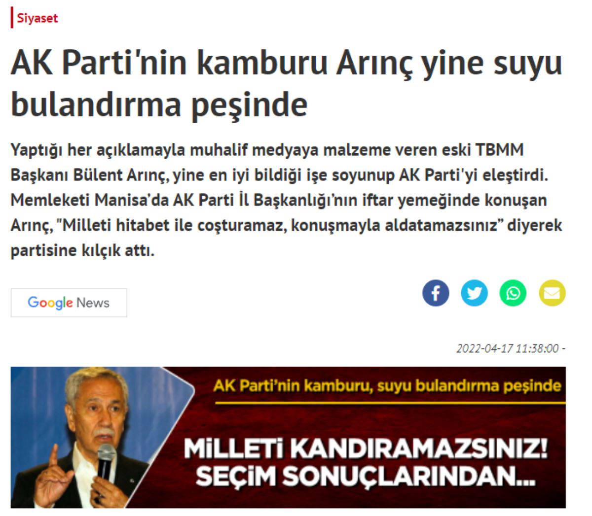 “Yaptığı her açıklamayla muhalif medyaya malzeme veren eski TBMM Başkanı Bülent Arınç, yine en iyi bildiği işe soyunup AK Parti'yi eleştirdi. Memleketi Manisa’da AK Parti İl Başkanlığı’nın iftar yemeğinde konuşan Arınç, 'Milleti hitabet ile coşturamaz, konuşmayla aldatamazsınız' diyerek partisine kılçık attı. Arınç, sorunların çözülmediği takdirde önümüzdeki seçimlerde partisinin başarılı olup olmayacağından emin olamadığını da söyledi.”
