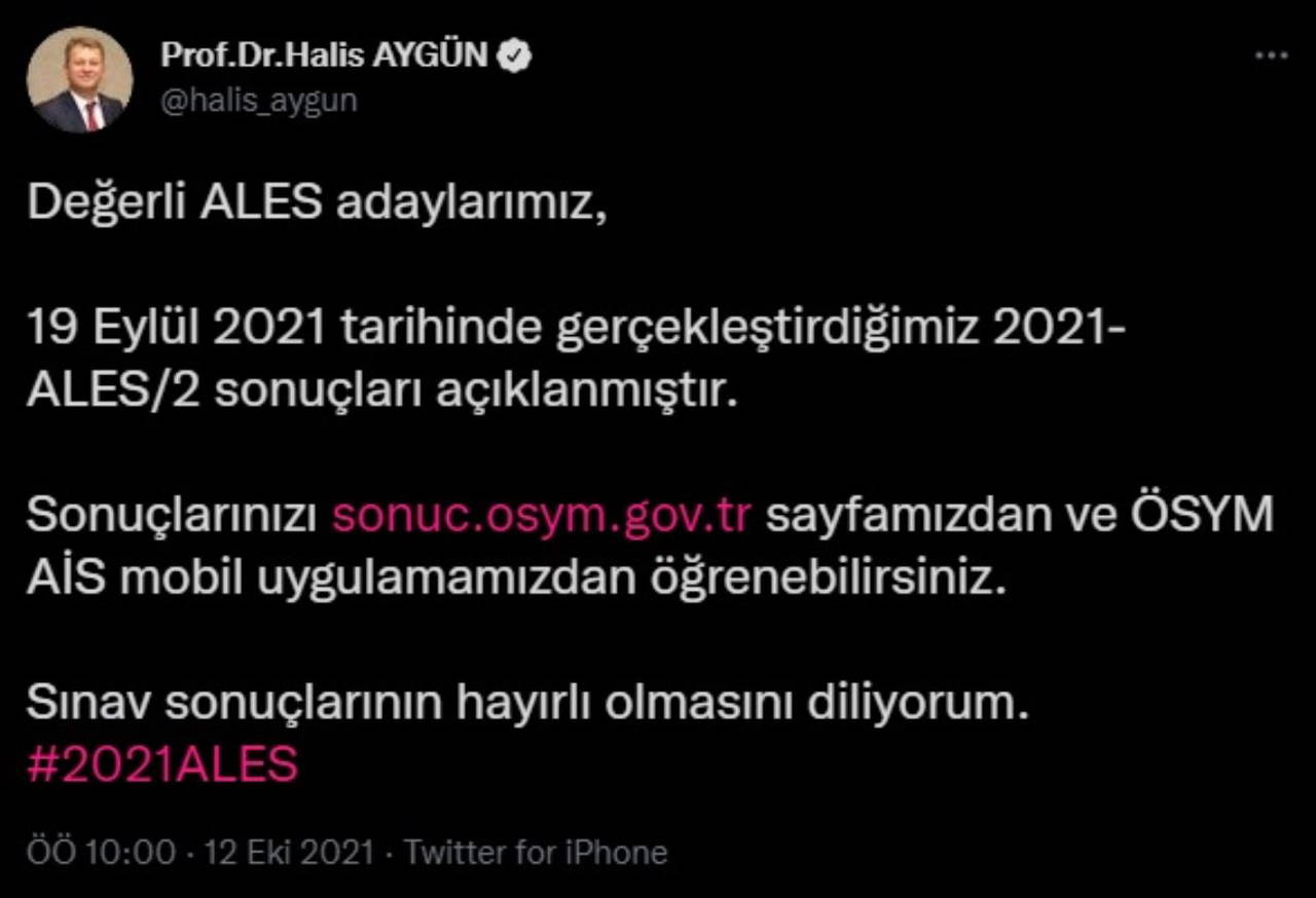"Değerli ALES adaylarımız, 19 Eylül 2021 tarihinde gerçekleştirdiğimiz 2021-ALES/2 sonuçları açıklanmıştır. Sonuçlarınızı http://sonuc.osym.gov.tr sayfamızdan ve ÖSYM AİS mobil uygulamamızdan öğrenebilirsiniz. Sınav sonuçlarının hayırlı olmasını diliyorum."