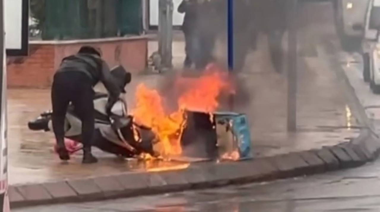 Kurye, motosikletini kurtarabilmek için kendini tehlikeye atarak yangını söndürmeye çalıştı ancak kuryenin müdahaleleri alevleri engelleyemedi.