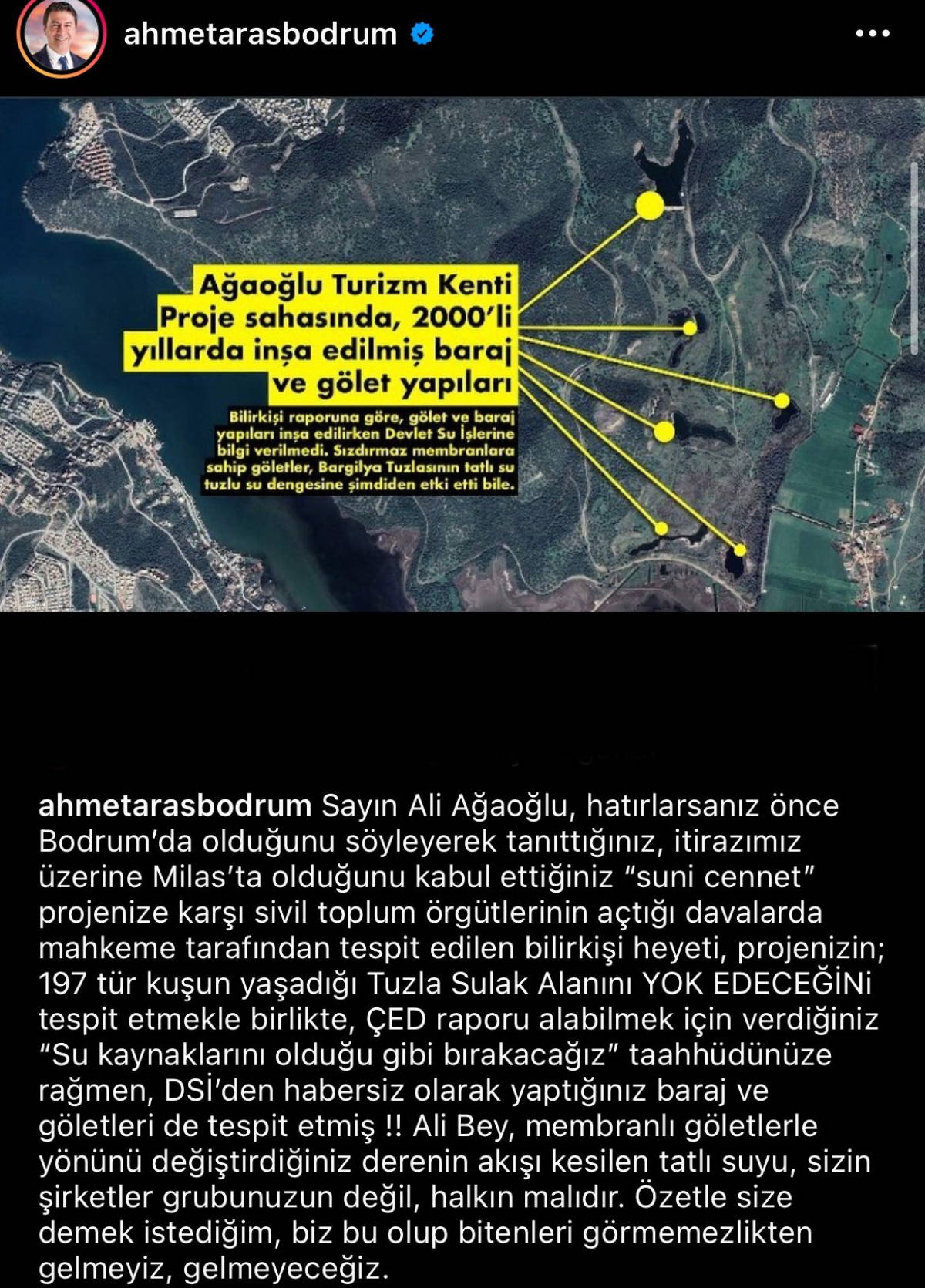 Bodrum Belediye Başkanı Ahmet Aras, sosyal medya hesabından Ali Ağaoğlu'nun, en önemli sulak alanlardan birisini mahvedecek, su kaynaklarının yönünü değiştiren "kaçak baraj ve göletler" yaptığını duyurdu.