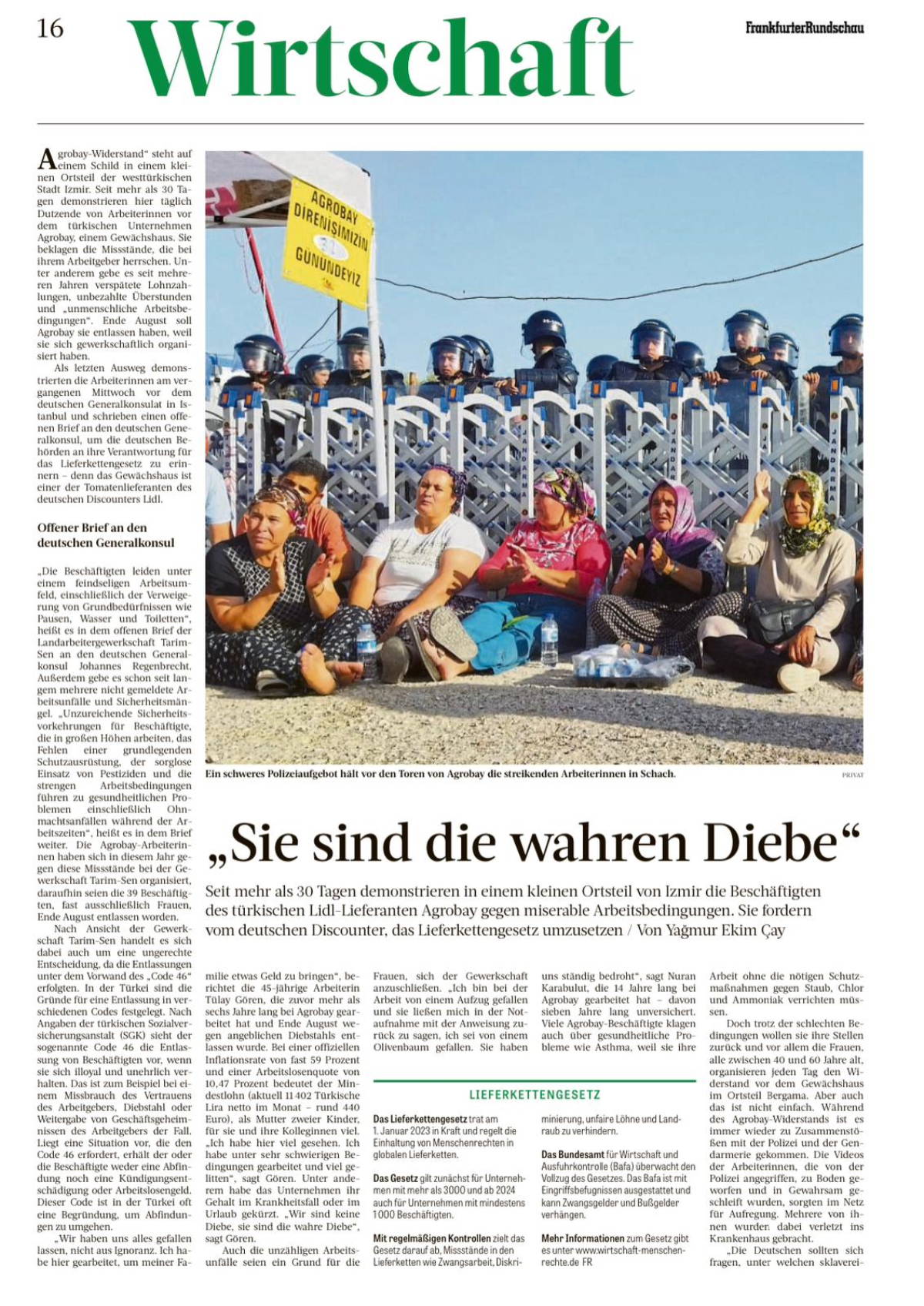 Almanya'da Frankfurter Rundschau isimli gazetenin Agrobay seracılık işçilerinin direnişini gündeme getirmesi ve Agrobay'ın Almanya'da bulunan firmalara tedarikçilik yaptığının yazılması üzerine harekete geçen firmanın sözcüsü şu ifadeleri kullandı: