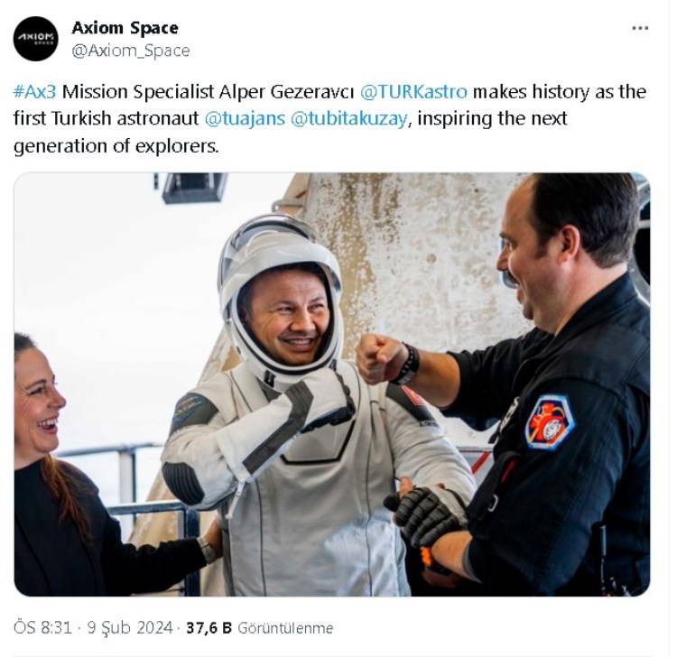 Axiom Space, tarafından sosyal medyada yapılan Alper Gezeravcı paylaşımında ise "Ax3 Görev Uzmanı Alper Gezeravcı, ilk Türk astronotu olarak tarih yazıyor. Türkiye Uzay Ajansı ve TÜBİTAK Uzay, gelecek nesil kaşiflere ilham veriyor" ifadeleri kullanıldı.