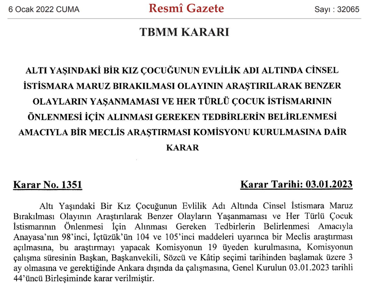 Resmi Gazete’de yayımlanan kararla “Altı yaşındaki bir kız çocuğunun evlilik adı altında cinsel istismara maruz bırakılması olayının araştırılarak benzer olayların yaşanmaması ve her türlü çocuk istismarının önlenmesi için alınması gereken tedbirlerin belirlenmesi amacıyla bir meclis araştırması komisyonu” kurulduğu ilan edildi.