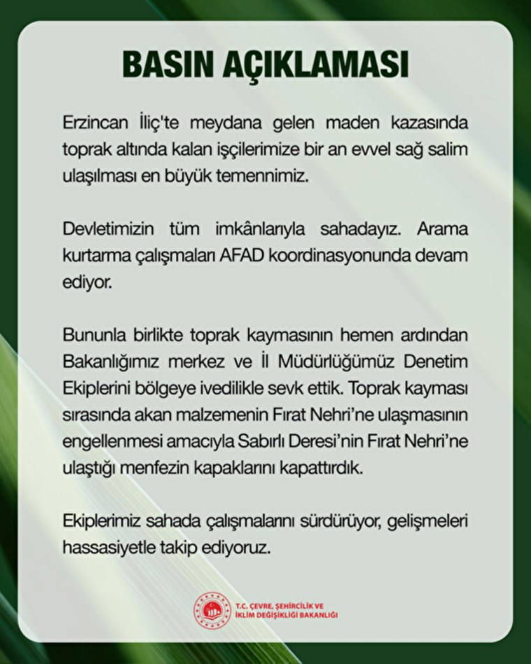 Açıklamada “Toprak kaymasının hemen ardından Bakanlığımız merkez ve İl müdürlüğümüz Denetim Ekiplerini bölgeye ivedilikle sevk ettik. Toprak kayması sırasında akan malzemenin Fırat Nehri'ne ulaşmasının engellenmesi amacıyla Sabırlı Deresi'nin Fırat Nehri'ne ulaştığı menfezin kapaklarını kapattırdık.