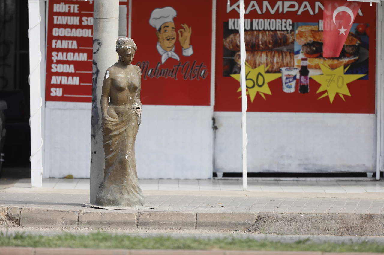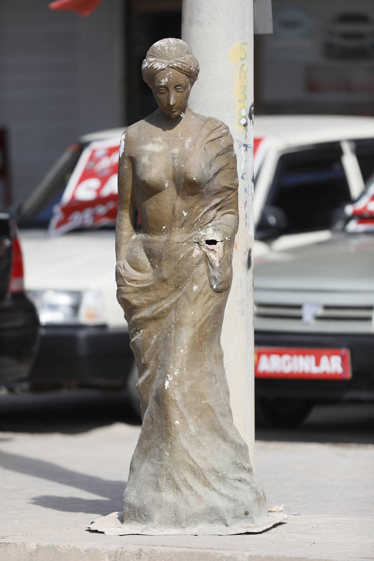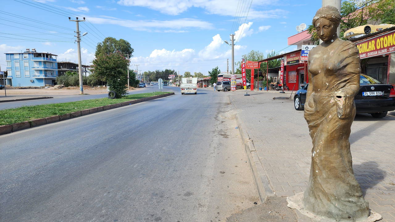 Kepez ilçesi Habipler Mahallesi Sütçüler Caddesi üzerindeki bir köfteci ve oto galeri işletmesi önündeki Venüs heykelinin portakal tuttuğu elinin kırıldığı ve eskidiği dikkati çekti.