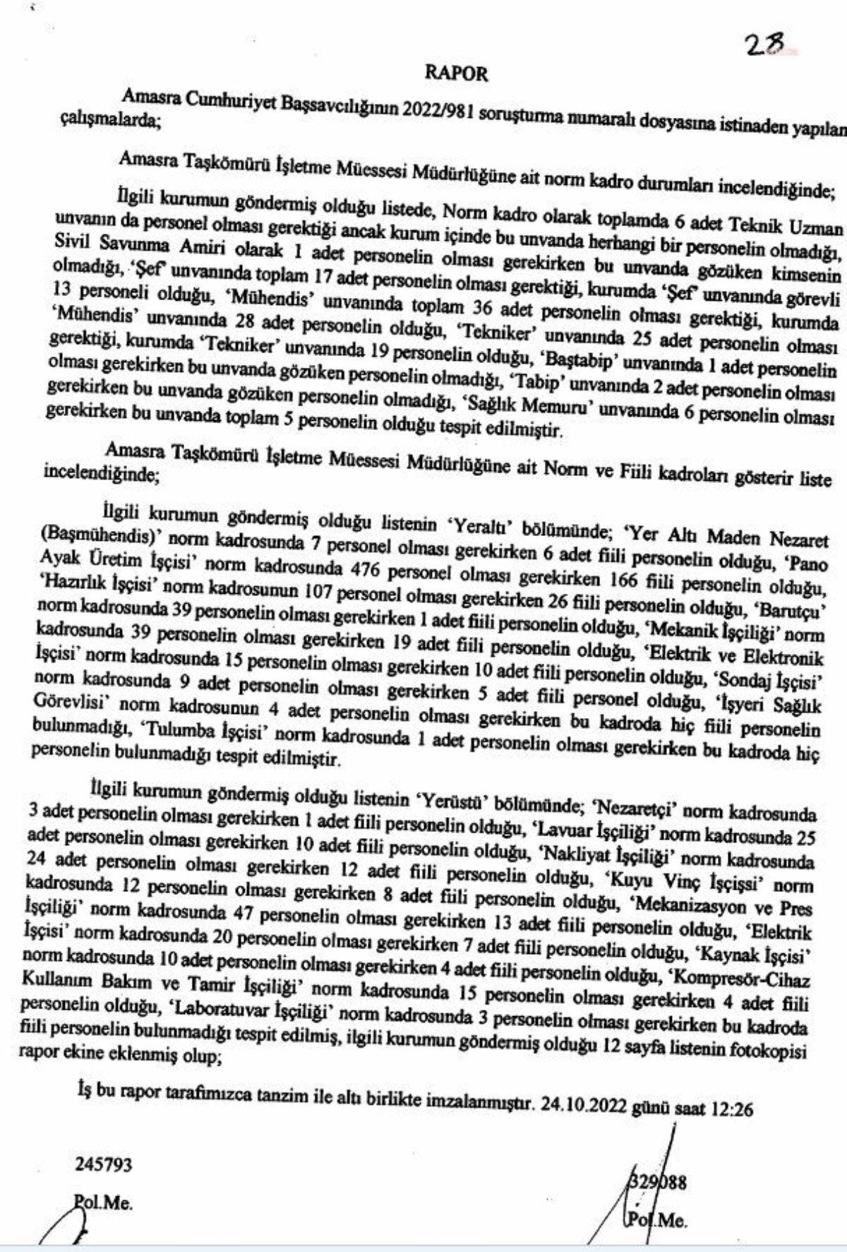 Tutanağa göre; müessesede normalde 476 pano ayak üretim işçisi çalıştırılması gerekiyordu. Ancak 476 işçinin yapacağı işin, üçte biri oranında, yani 166 işçiye yaptırıldığı tespit edildi. Kadrodaki eksiklikler pano ayak üretim işçisiyle de bitmedi. Madendeki patlamaları yapan barutçu sayısının da az olduğu belirlendi. Tutanakta, “Barutçu norm kadrosunda 39 personelin olması gerekirken bir adet fiili personel olduğu tespit edilmiştir” denildi.