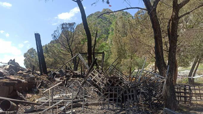 Çevredekilerin ihbarıyla olay yerine polis, sağlık ve itfaiye ekipleri sevk edildi. Dağ eteğine ulaşmada güçlük çeken itfaiye ekipleri, yaklaşık 100 metre uzaklıktan hortum çekerek yangına müdahale etti. Yangın, 1 saatlik çalışmanın ardından kontrol altına alındı. Kafeterya küle dönerken, 3 tarihi binada hasar oluştu.