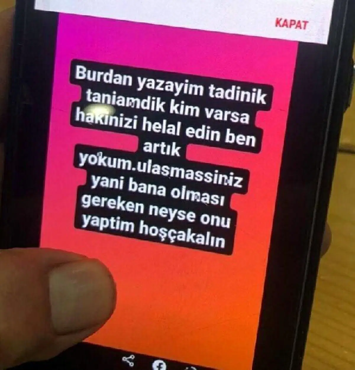 Öte yandan R.B.'nin, cinayetin hemen ardından, anlık mesajlaşma uygulaması WhatsApp'taki hikaye bölümünde, 'Buradan yazayım. Tanıdık, tanımadık kim varsa hakkınızı helal edin. Ben artık yokum, ulaşamazsanız yani bana. Olması gereken neyse onu yaptım, hoşça kalın' yazısını paylaştığı ortaya çıktı.