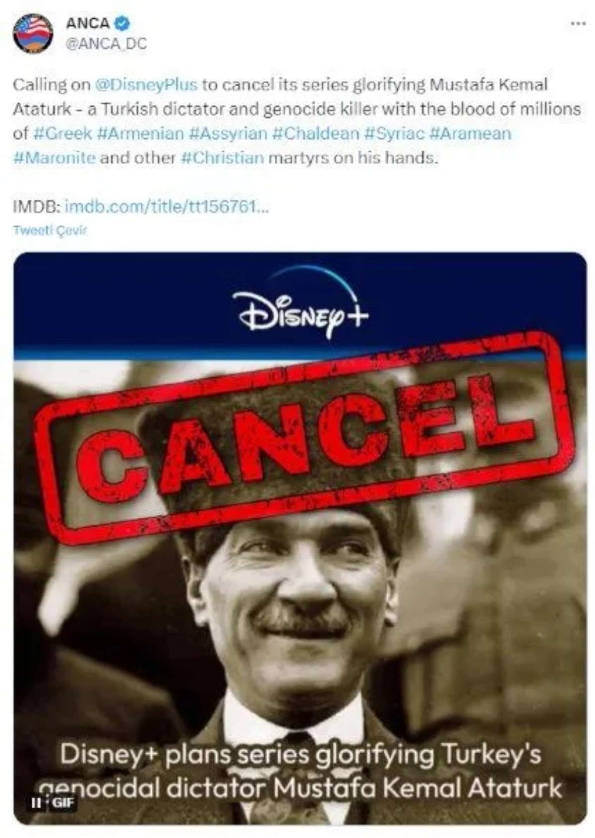 Paylaşımda, "Disney Plus'a, elinde milyonlarca Yunan, Ermeni, Süryani, Keldani, Arami, Maronit ve diğer Hıristiyan şehitlerin kanıyla bir Türk diktatörü ve soykırım katili olan Mustafa Kemal Atatürk'ü yücelten dizisini iptal etmesi çağrısında bulunuyoruz" ifadeleri kullanıldı.