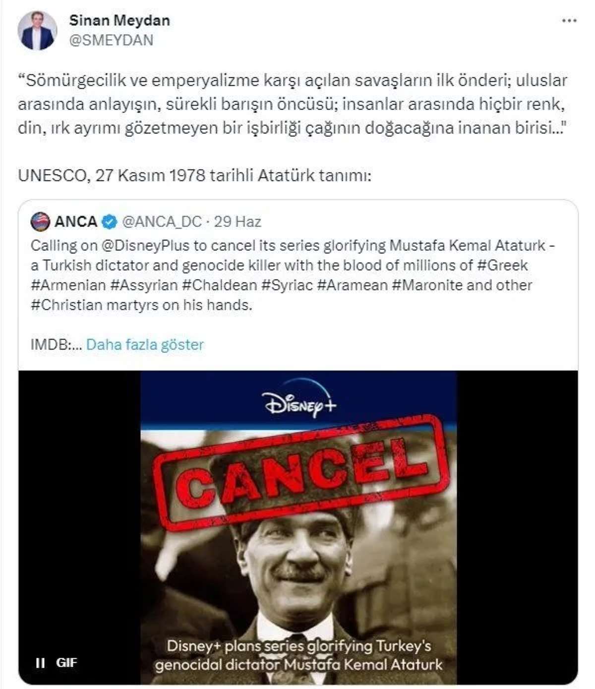 Son olarak The Armenian National Committee of America-Amerika Ulusal Ermeni Komitesi (ANCA), sosyal medya hesabından bir paylaşım yaparak Disney Plus Türkiye'nin 'Atatürk' dizisinin iptal edilmesini istedi.