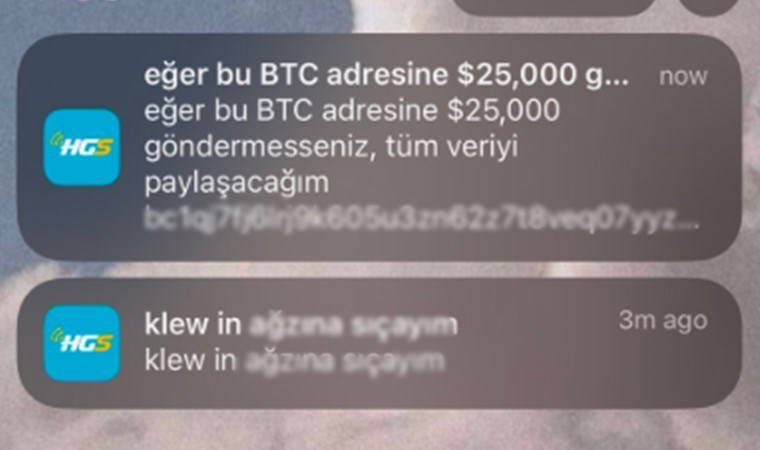 Telefonunda HGS uygulaması olan kişilere, uygulama tarafından "eğer bu BTC adresine 25 bin dolar göndermezseniz tüm veriyi paylaşacağım" mesajı atıldı.