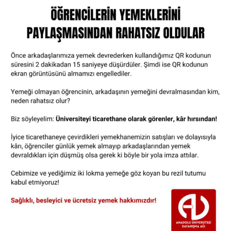 Öğrenciler söz konusu karara tepki gösterdi. Anadolu Dayanışma Ağı tarafından sosyal medyadan yapılan açıklamada, “Önce arkadaşlarımıza yemek devrederken kullandığımız QR kodunun süresini 2 dakikadan 15 saniyeye düşürdüler. Şimdi ise QR kodunun ekran görüntüsünü almamızı engellediler. Yemeği olmayan öğrencinin, arkadaşının yemeğini devralmasından kim, neden rahatsız olur? Biz söyleyelim: Üniversiteyi ticarethane olarak görenler, kâr hırsından! İyice ticarethaneye çevirdikleri yemekhanemizin satışları ve dolayısıyla kârı, öğrenciler günlük yemek almayıp arkadaşlarından yemek devraldıkları için düşmüş olsa gerek ki böyle bir yola imza attılar. Cebimize ve yediğimiz iki lokma yemeğe göz koyan bu rezil tutumu kabul etmiyoruz!” ifadeleri kullanıldı.