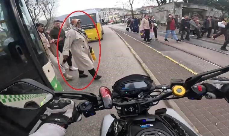 Bursa’da motosiklet sürücüsünün yolun karşısına geçen yayaya çarpmamak için hayat kurtaran manevrası kask kamerasına saniye saniye yansıdı.