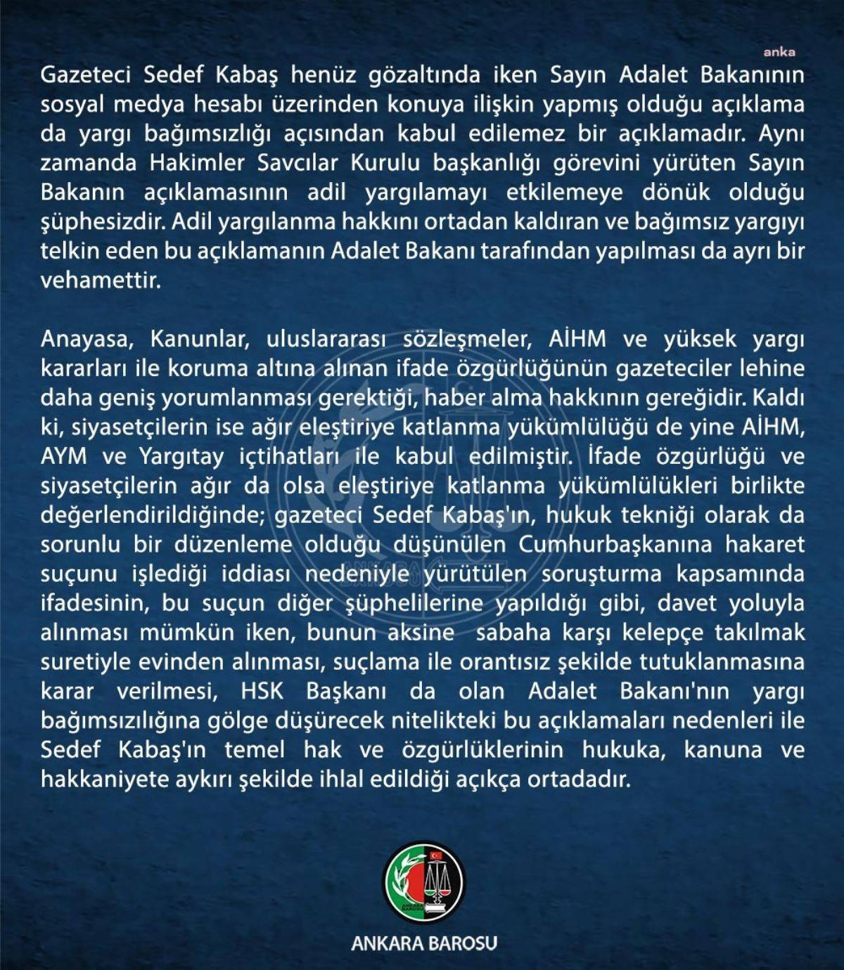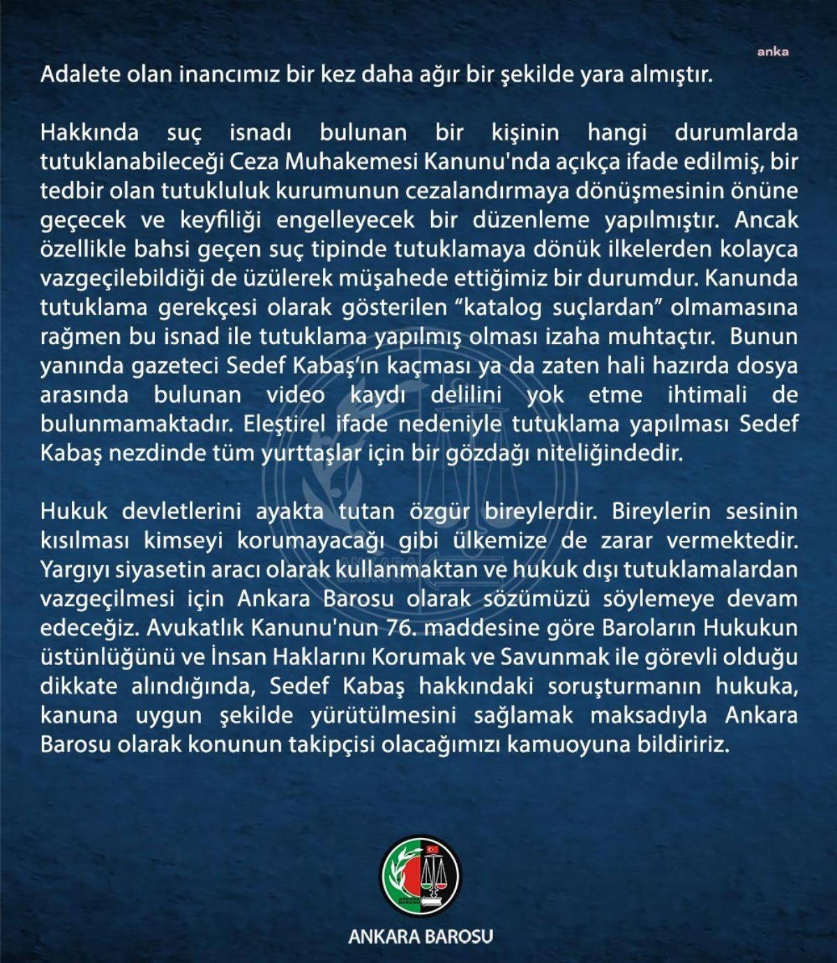 Hukuk devletlerini ayakta tutan özgür bireylerdir. Bireylerin sesinin kısılması kimseyi korumayacağı gibi ülkemize de zarar vermektedir. Yargıyı siyasetin aracı olarak kullanmaktan ve hukuk dışı tutuklamalardan vazgeçilmesi için Ankara Barosu olarak sözümüzü söylemeye devam edeceğiz. Avukatlık Kanunu'nun 76. maddesine göre baroların hukukun üstünlüğünü ve insan haklarını korumak ve savunmak ile görevli olduğu dikkate alındığında, Sedef Kabaş hakkındaki soruşturmanın hukuka, kanuna uygun şekilde yürütülmesini sağlamak maksadıyla Ankara Barosu olarak konunun takipçisi olacağımızı kamuoyuna bildiririz."