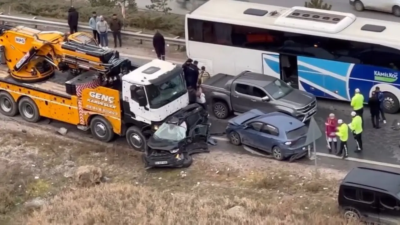 Kırıkkale yönüne giden vinç, yoldaki buzlanma nedeniyle sürücüsünün kontrolünden çıkıp, aralarında yolcu otobüsünün de bulunduğu 13 araca çarptı. Çevredekilerin ihbarı üzerine polis, sağlık ve itfaiye ekipleri kaza yerine sevk edildi.