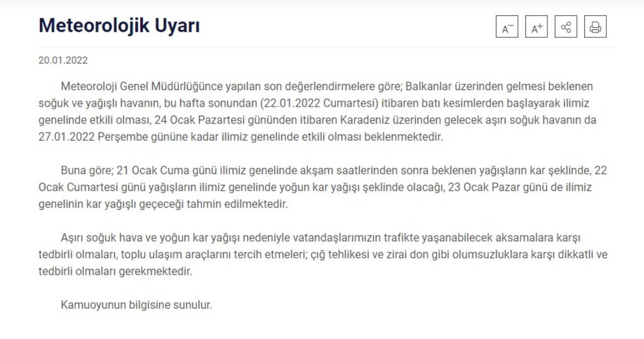 “Meteoroloji Genel Müdürlüğü’nce yapılan son değerlendirmelere göre; Balkanlar üzerinden gelmesi beklenen soğuk ve yağışlı havanın, bu hafta sonundan (22.01.2022 Cumartesi) itibaren batı kesimlerden başlayarak ilimiz genelinde etkili olması, 24 Ocak Pazartesi gününden itibaren Karadeniz üzerinden gelecek aşırı soğuk havanın da 27.01.2022 Perşembe gününe kadar ilimiz genelinde etkili olması beklenmektedir.