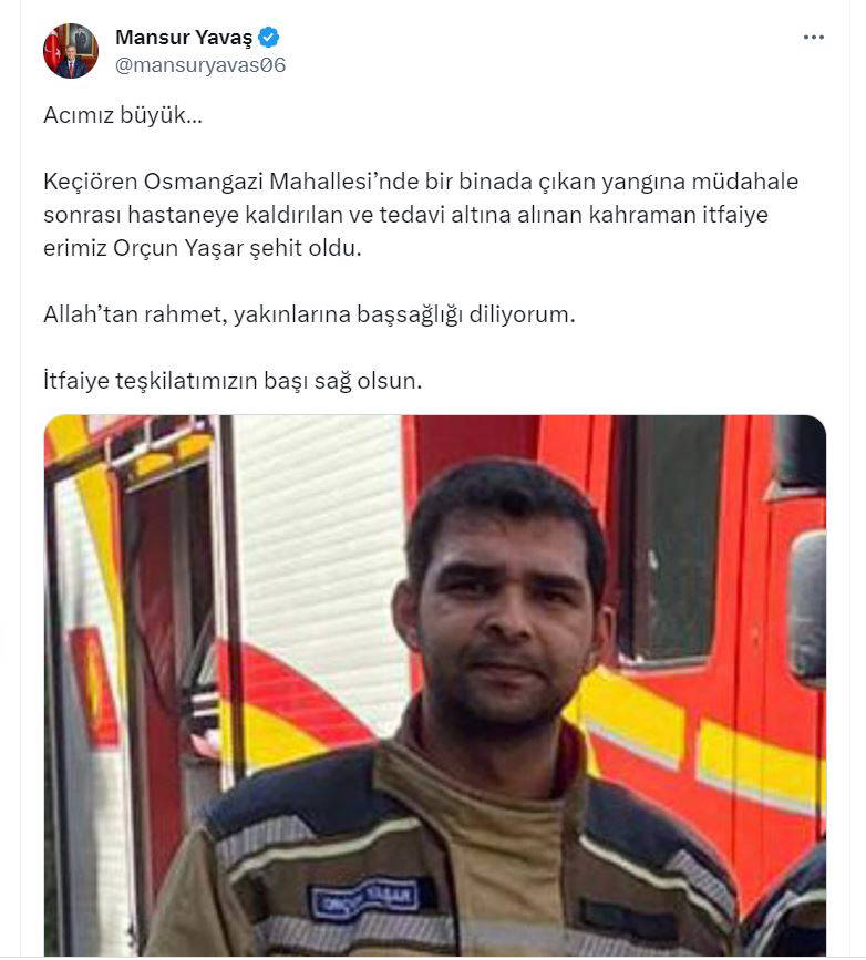 Yavaş, "Acımız büyük. Keçiören Osmangazi Mahallesi’nde bir binada çıkan yangına müdahale sonrası hastaneye kaldırılan ve tedavi altına alınan kahraman itfaiye erimiz Orçun Yaşar şehit oldu. Allah'tan rahmet, yakınlarına başsağlığı diliyorum. İtfaiye teşkilatımızın başı sağ olsun" dedi.
