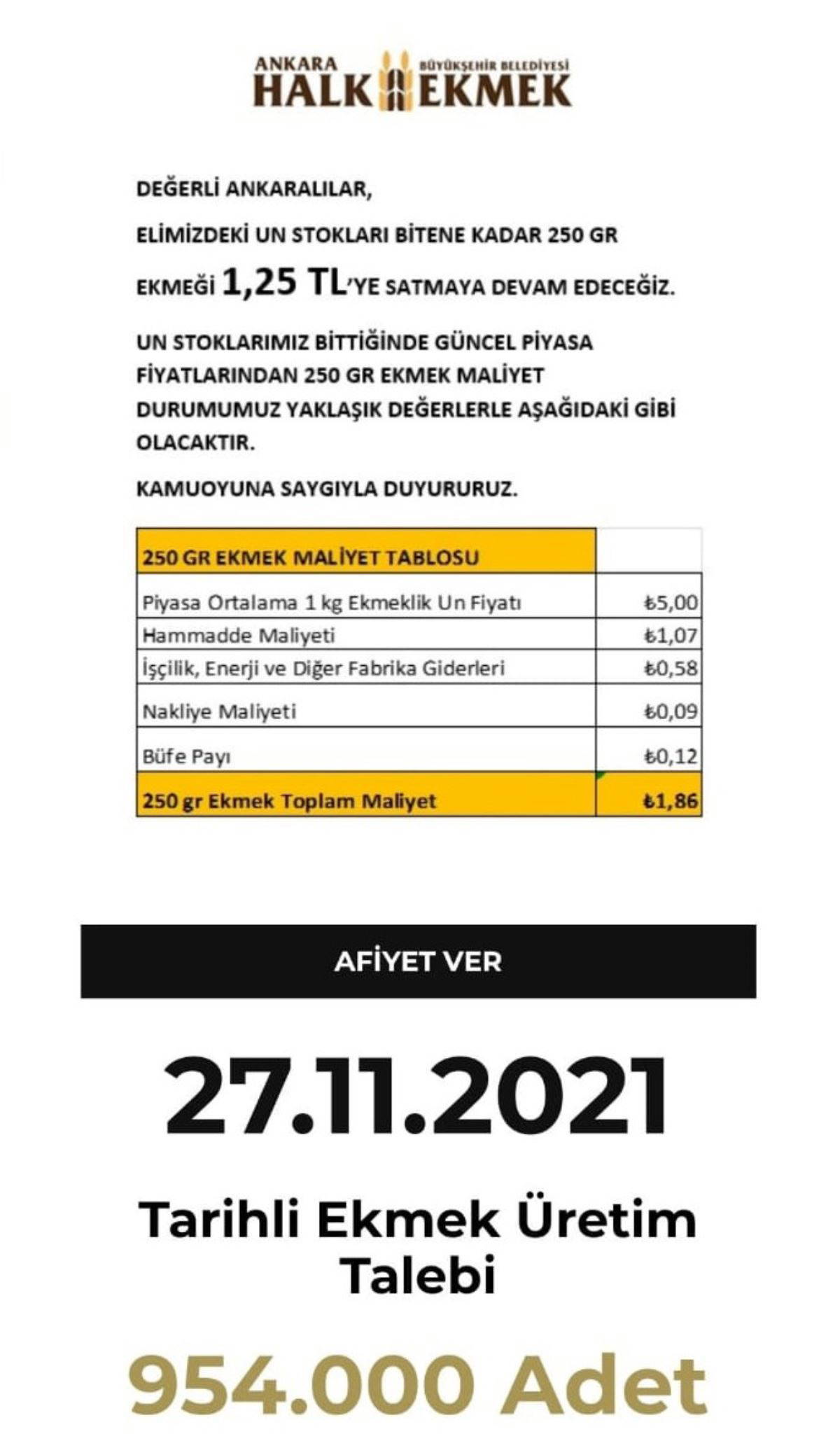 Ankara Halk Ekmek ve Un Fabrikası, sosyal paylaşım sitesi Twitter hesabı üzerinden yaptığı paylaşımda, “Değerli Ankaralılar, elimizdeki un stokları bitene kadar 250 gr ekmeği 1.25 TL’ye satmaya devam edeceğiz. Un stoklarımız bittiğinde güncel piyasa fiyatlarından 250 gr ekmek maliyet durumumuz yaklaşık değerlere aşağıdaki gibi olacaktır” dedi.