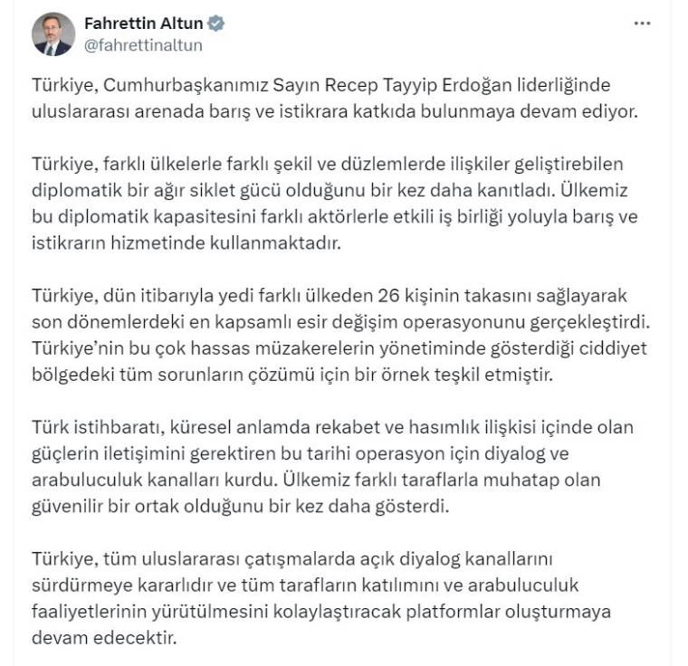 Türkiye'nin dün 7 farklı ülkeden 26 kişinin takasını sağlayıp son dönemlerdeki en kapsamlı esir değişim operasyonunu gerçekleştirdiğini vurgulayan Altun, "Türkiye'nin bu çok hassas müzakerelerin yönetiminde gösterdiği ciddiyet bölgedeki tüm sorunların çözümü için bir örnek teşkil etmiştir. Türk istihbaratı, küresel anlamda rekabet ve hasımlık ilişkisi içinde olan güçlerin iletişimini gerektiren bu tarihi operasyon için diyalog ve ara buluculuk kanalları kurdu. Ülkemiz farklı taraflarla muhatap olan güvenilir bir ortak olduğunu bir kez daha gösterdi. Türkiye, tüm uluslararası çatışmalarda açık diyalog kanallarını sürdürmeye kararlıdır ve tüm tarafların katılımını ve ara buluculuk faaliyetlerinin yürütülmesini kolaylaştıracak platformlar oluşturmaya devam edecektir" ifadelerini kullandı.