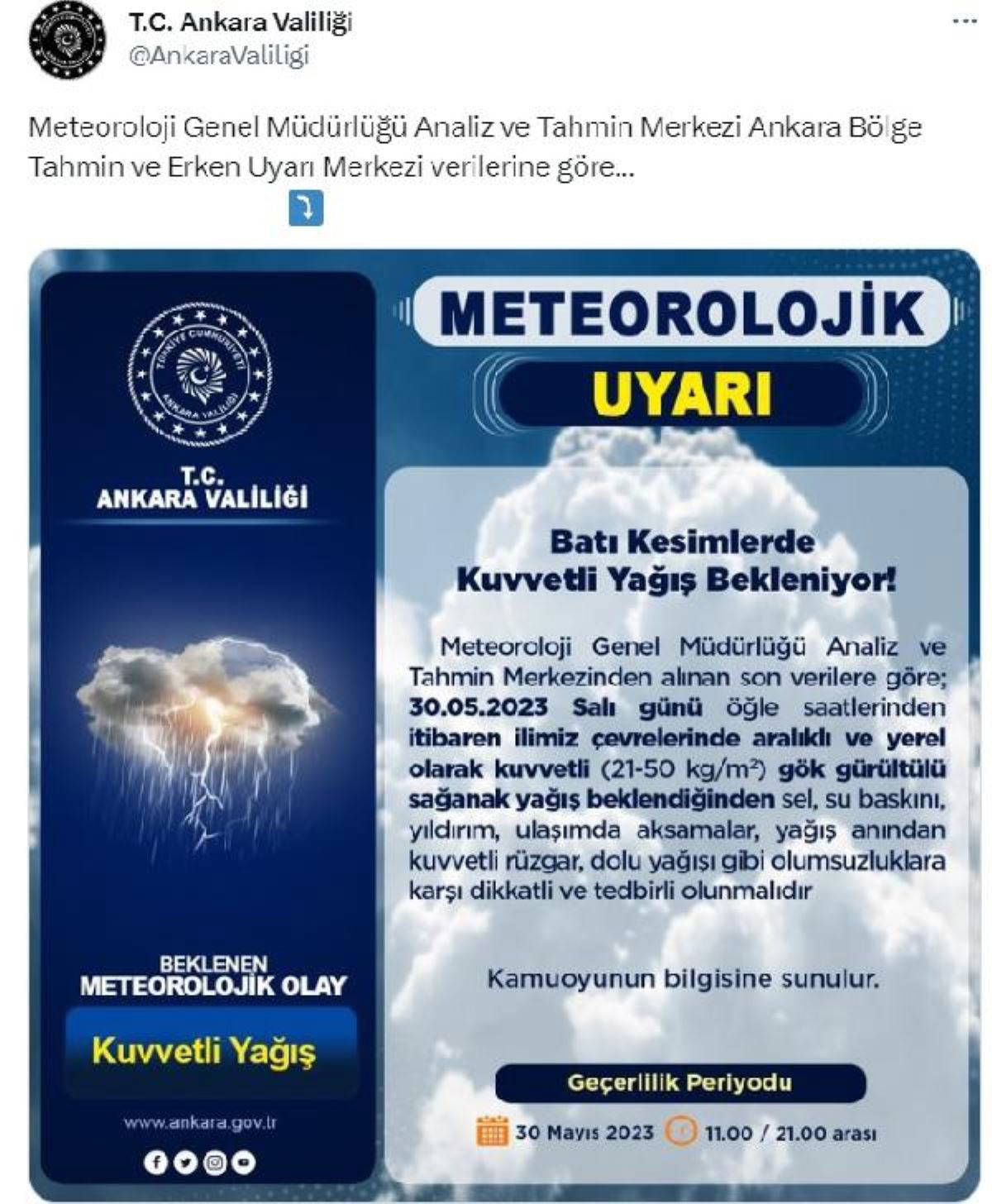 Valilikten yapılan açıklamada, "Meteoroloji Genel Müdürlüğü Analiz ve Tahmin Merkezi Ankara Bölge Tahmin ve Erken Uyarı Merkezi verilerine göre; 30 Mayıs Salı günü öğle saatlerinden itibaren ilimiz çevrelerinde aralıklı ve yerel olarak kuvvetli (21-50 kilogram/metre) gök gürültülü sağanak yağış beklendiğinden sel, su baskını, yıldırım, ulaşımda aksamalar, yağış anından kuvvetli rüzgar, dolu yağışı gibi olumsuzluklara karşı dikkatli ve tedbirli olunmalıdır" denildi.