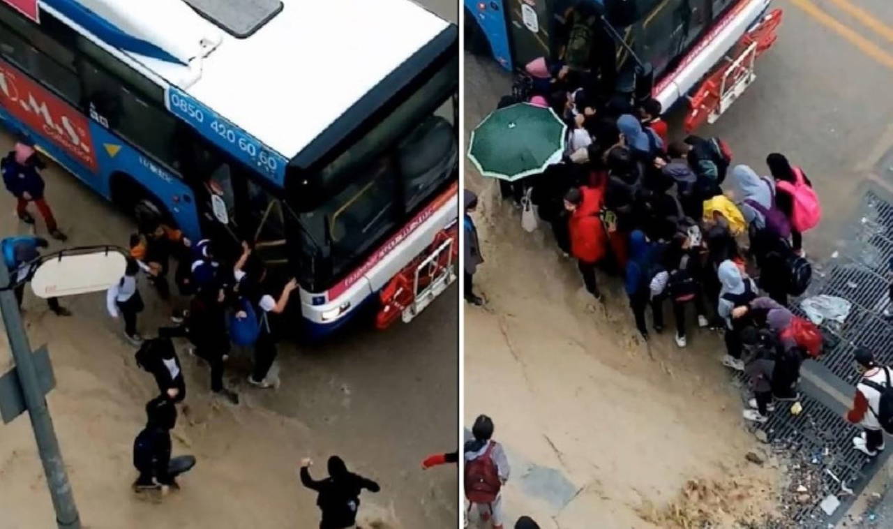 YAĞMURDA BEKLEYEN ÖĞRENCİLERDEN OTOBÜSE AKIN