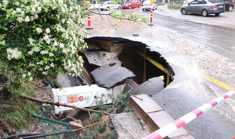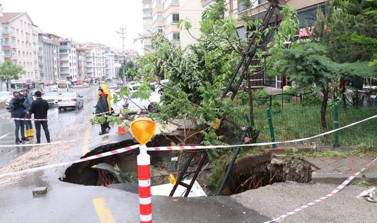 Sağanağın en büyük fazla etkili olduğu Yenimahalle ilçesinde bulunan Demetevler Mahallesi Cemal Arseven Caddesi’nde çöken yolda, ekipler önlem aldı.